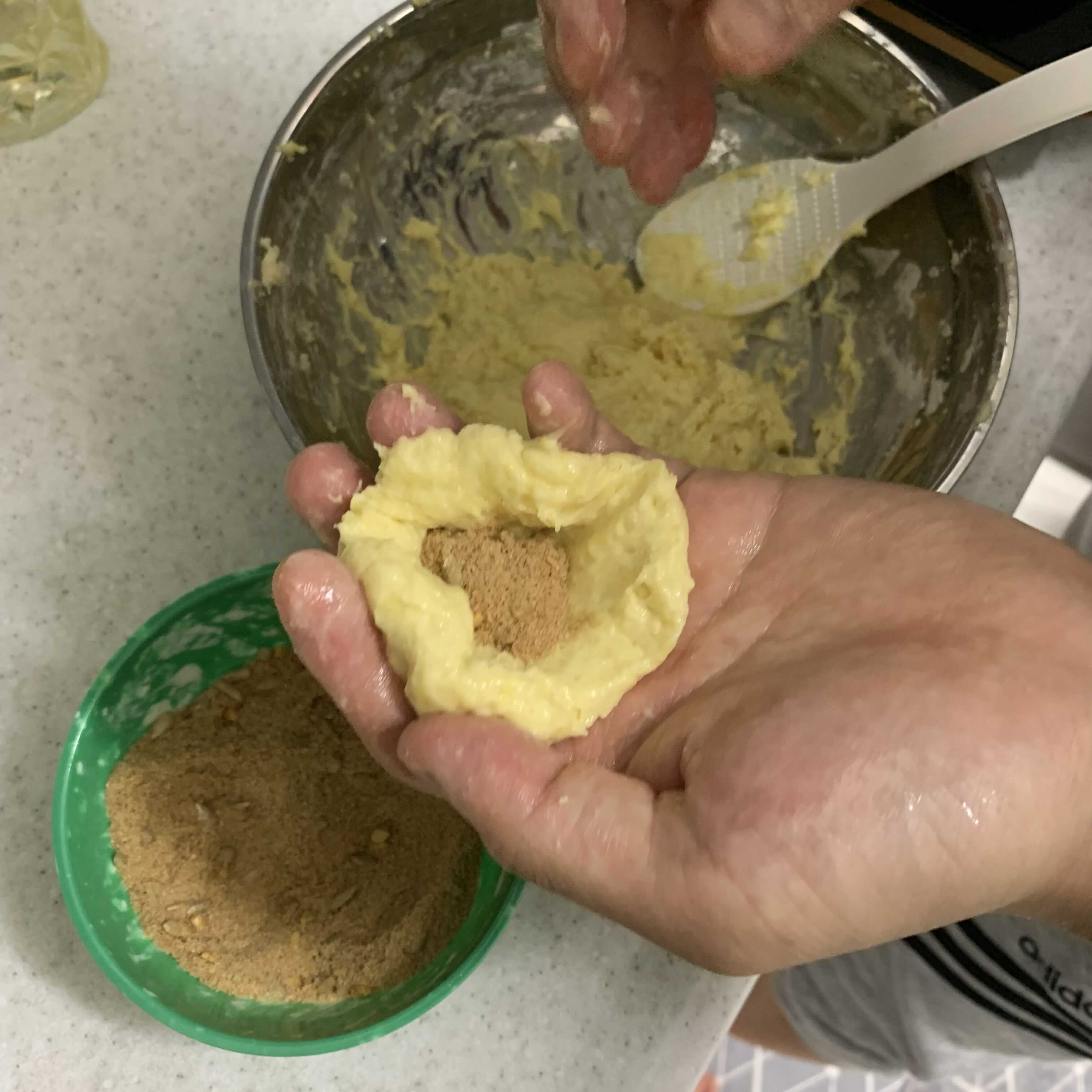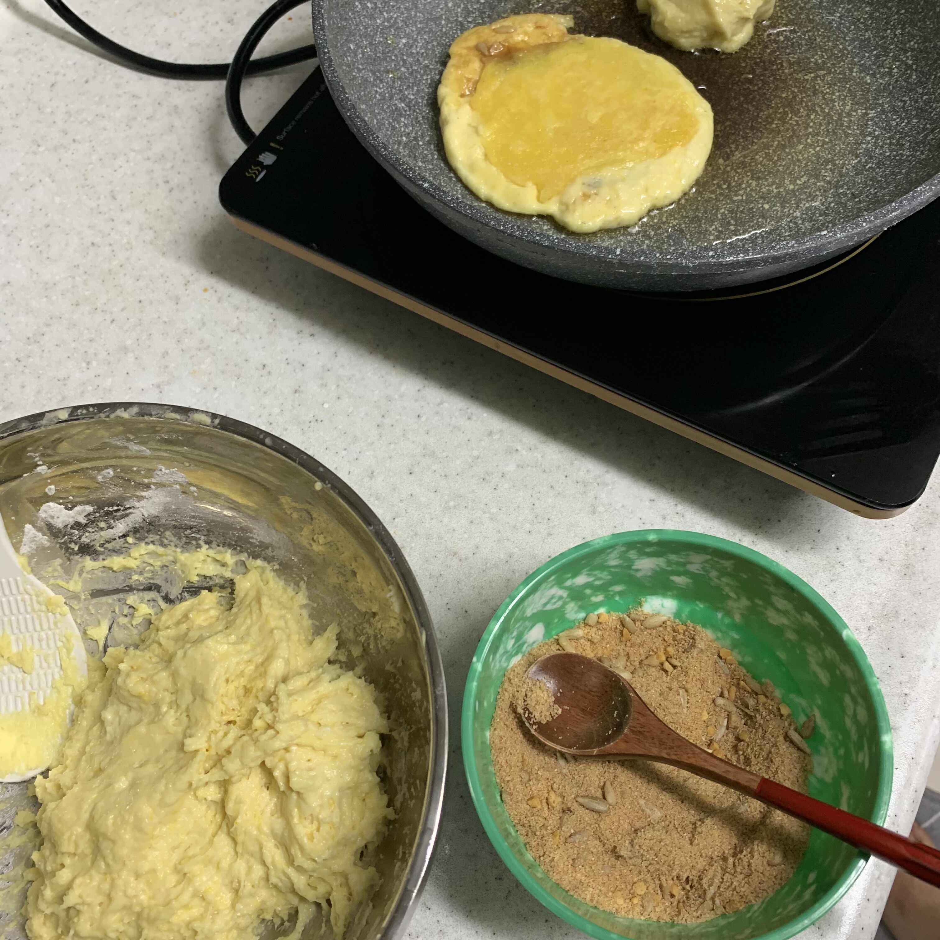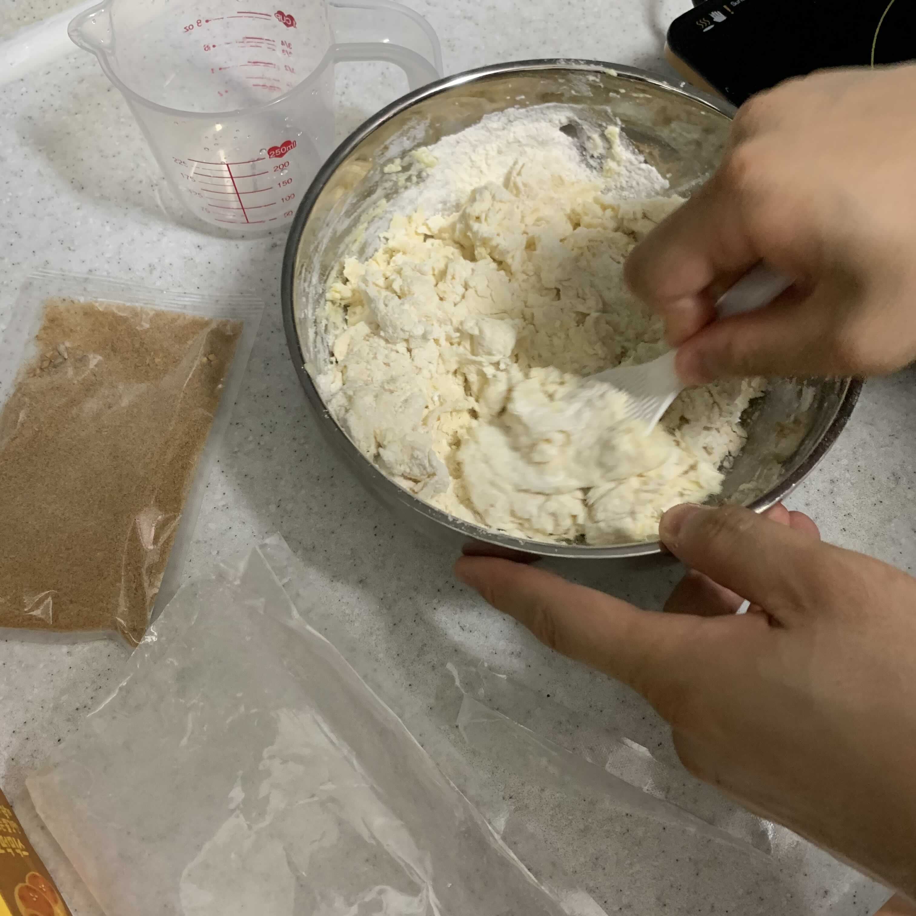 나중에 설탕이 너무 많이 남기도 하고 호떡을 만들때 골고루 설탕이 퍼져야 하는데 너무 적게 넣으니 가운대에만 달콤하고 겉에는 맛이 나지 않았습니다. 설탕을 많이 넣은 후 골고루 잘 퍼질 수 있도록 눌러주세요.
