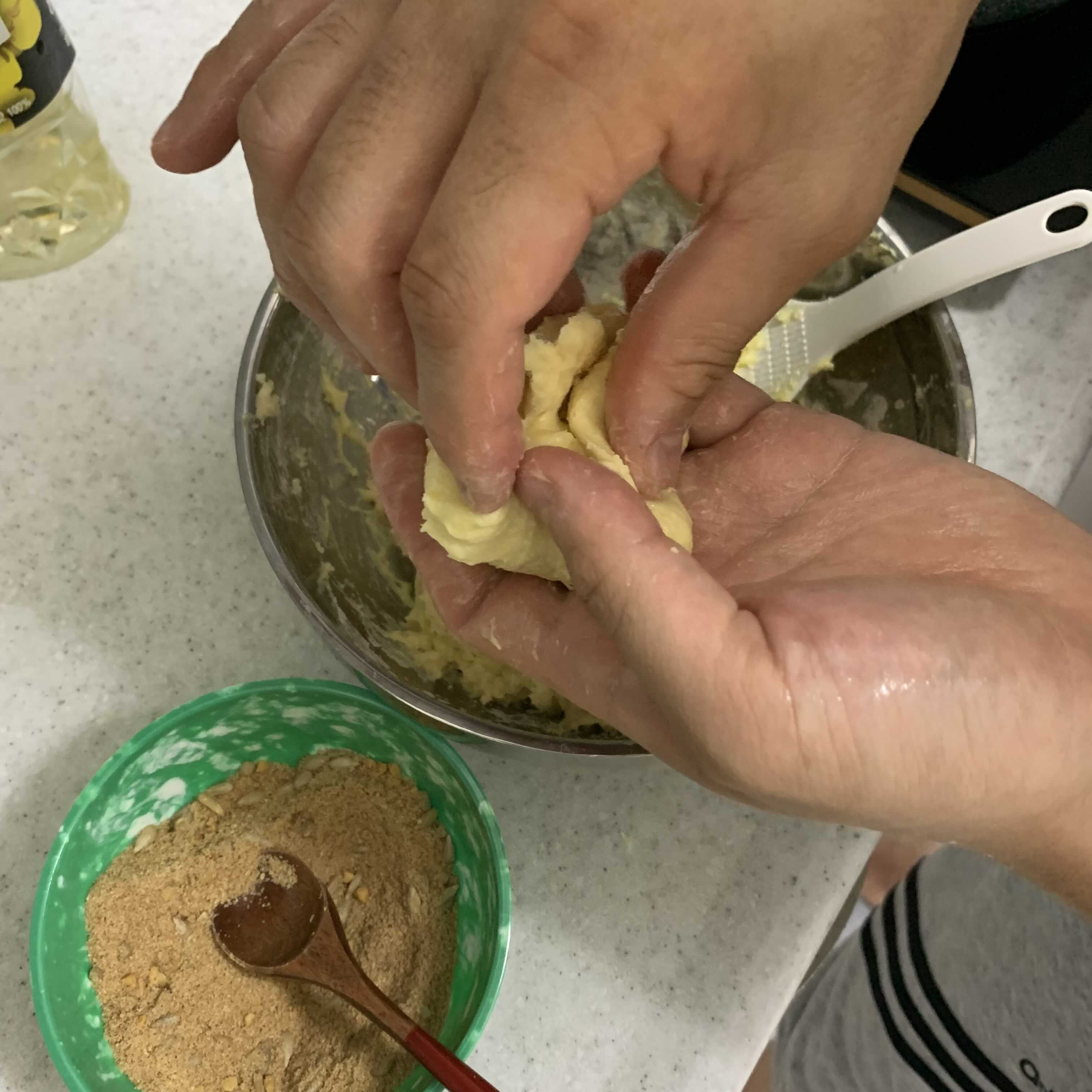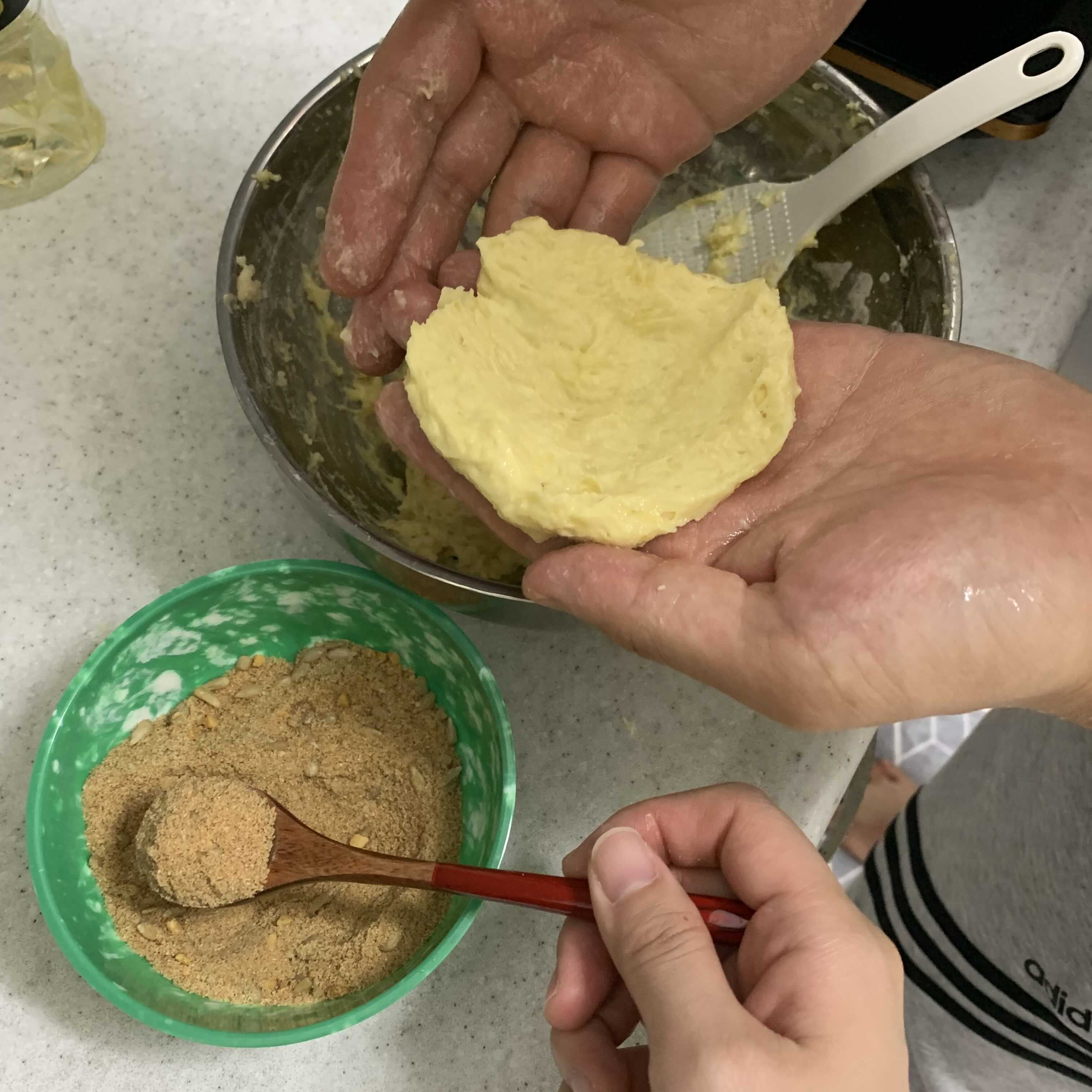 2. 손에 식용류를 바른 후 반죽을 떼어 손바닥 위에 넓게 편 후 잼믹스를 넣어 터지지 않게 잘 모아준다.