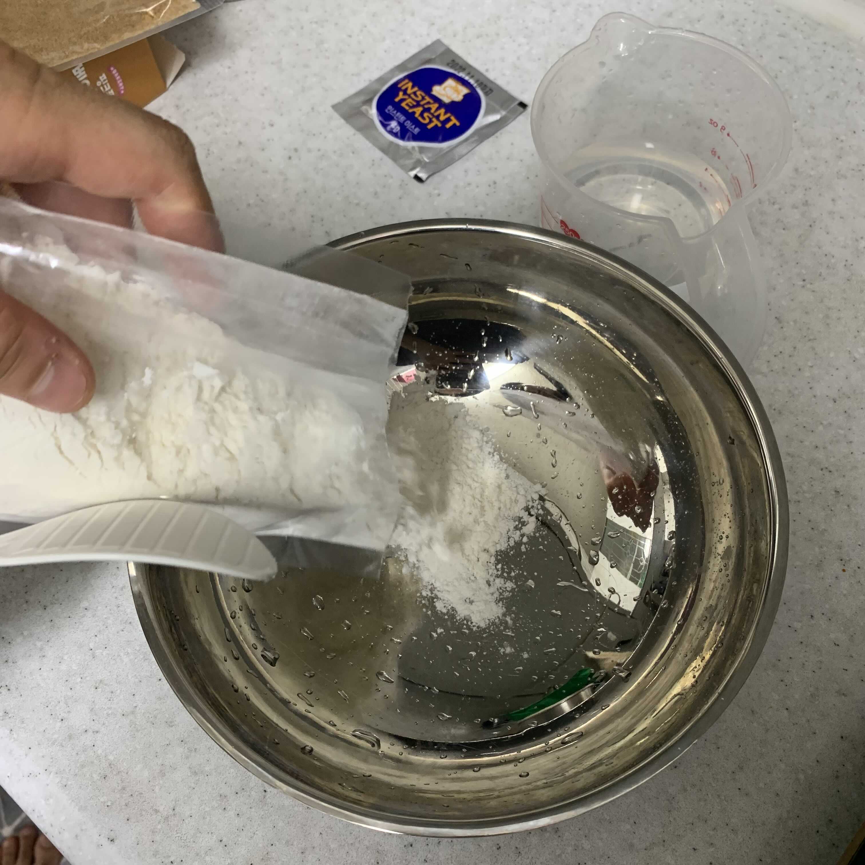 1. 볼에 따뜻한 물을 150ml와 이스트를 넣고 잘 저어주고 반죽용 믹스를 넣고 주걱으로 다시 잘 섞는다.