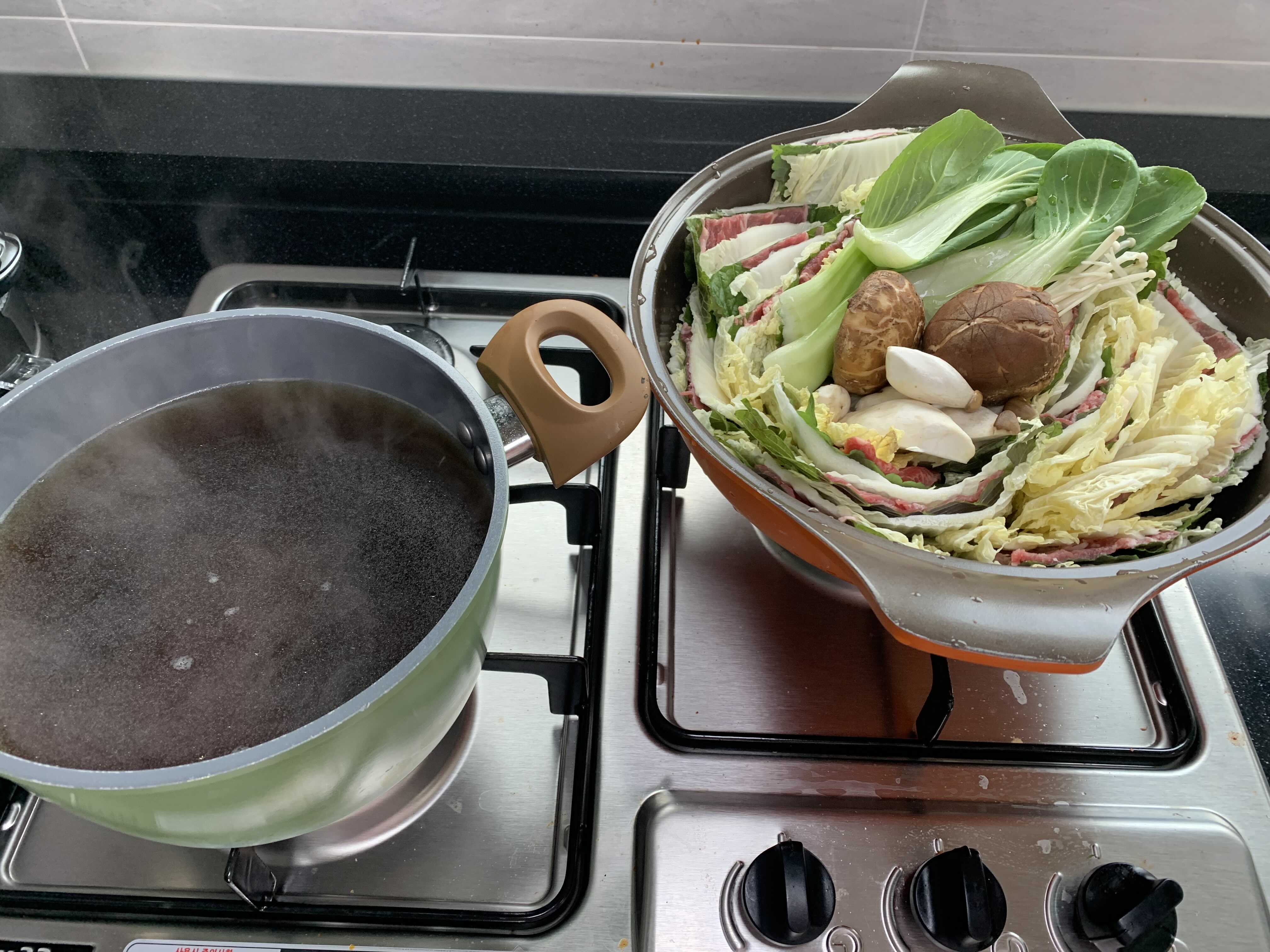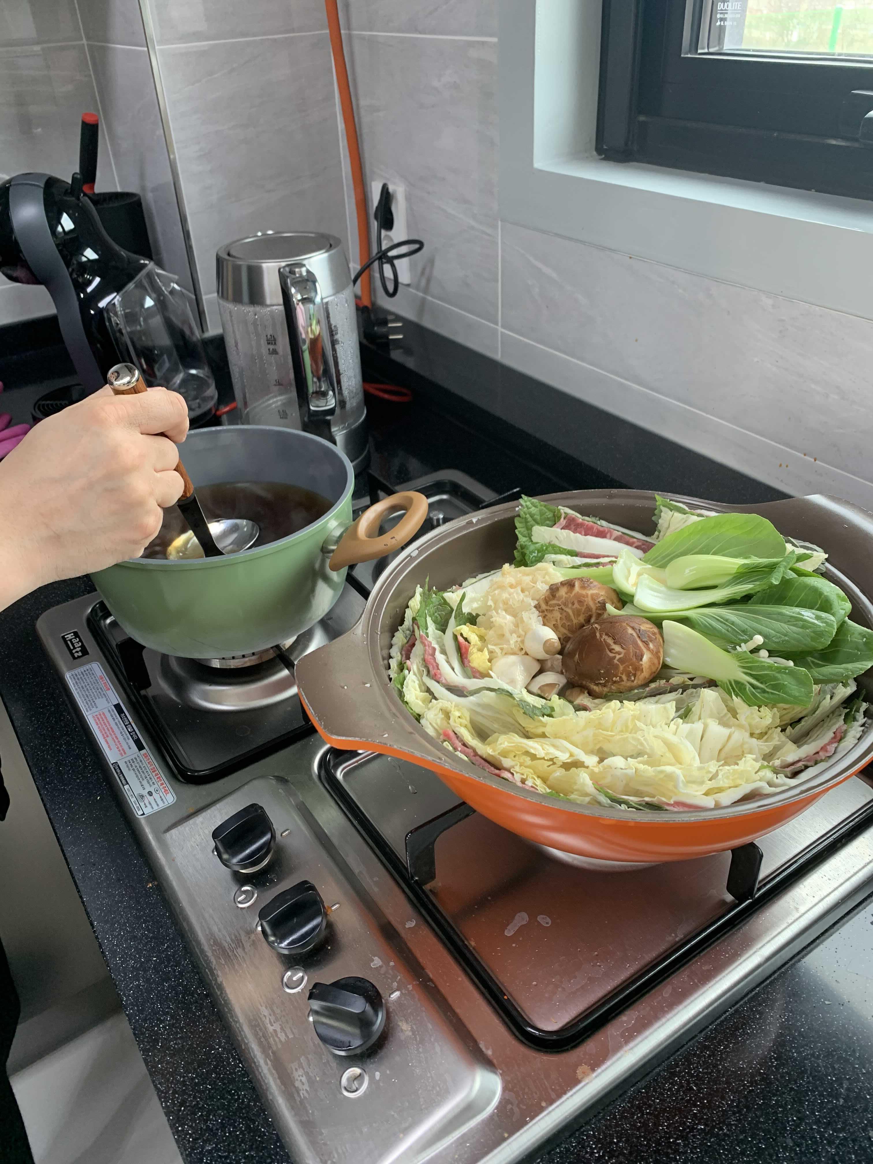 4. 나베 끓이기 - 재료를 담은 냄비에 육수를 반 정도 붓고 강불에 끓이기 , 육수가 끓으면 중불로 줄여 15분 끓인 후 소스를 곁들여 먹기,