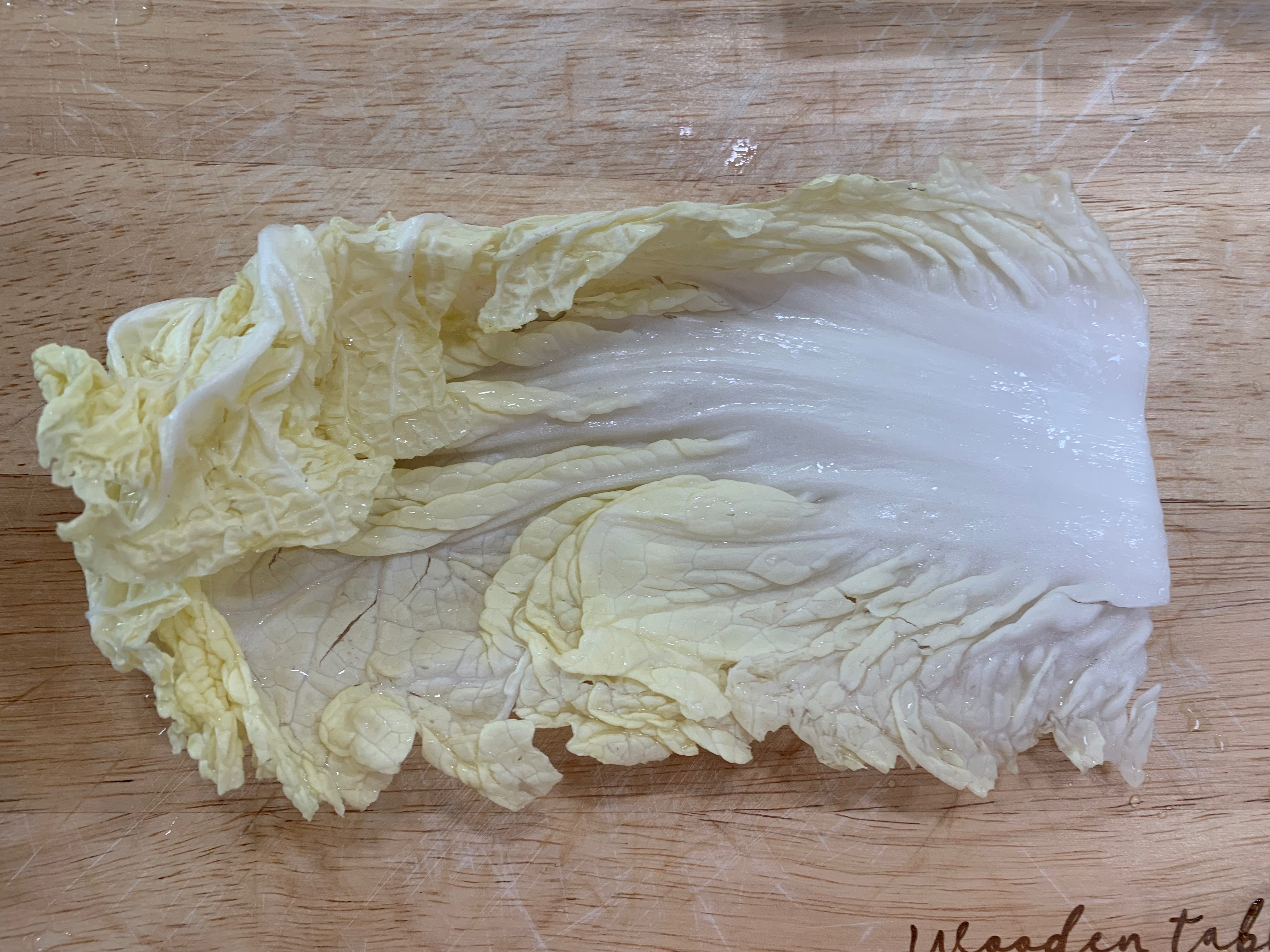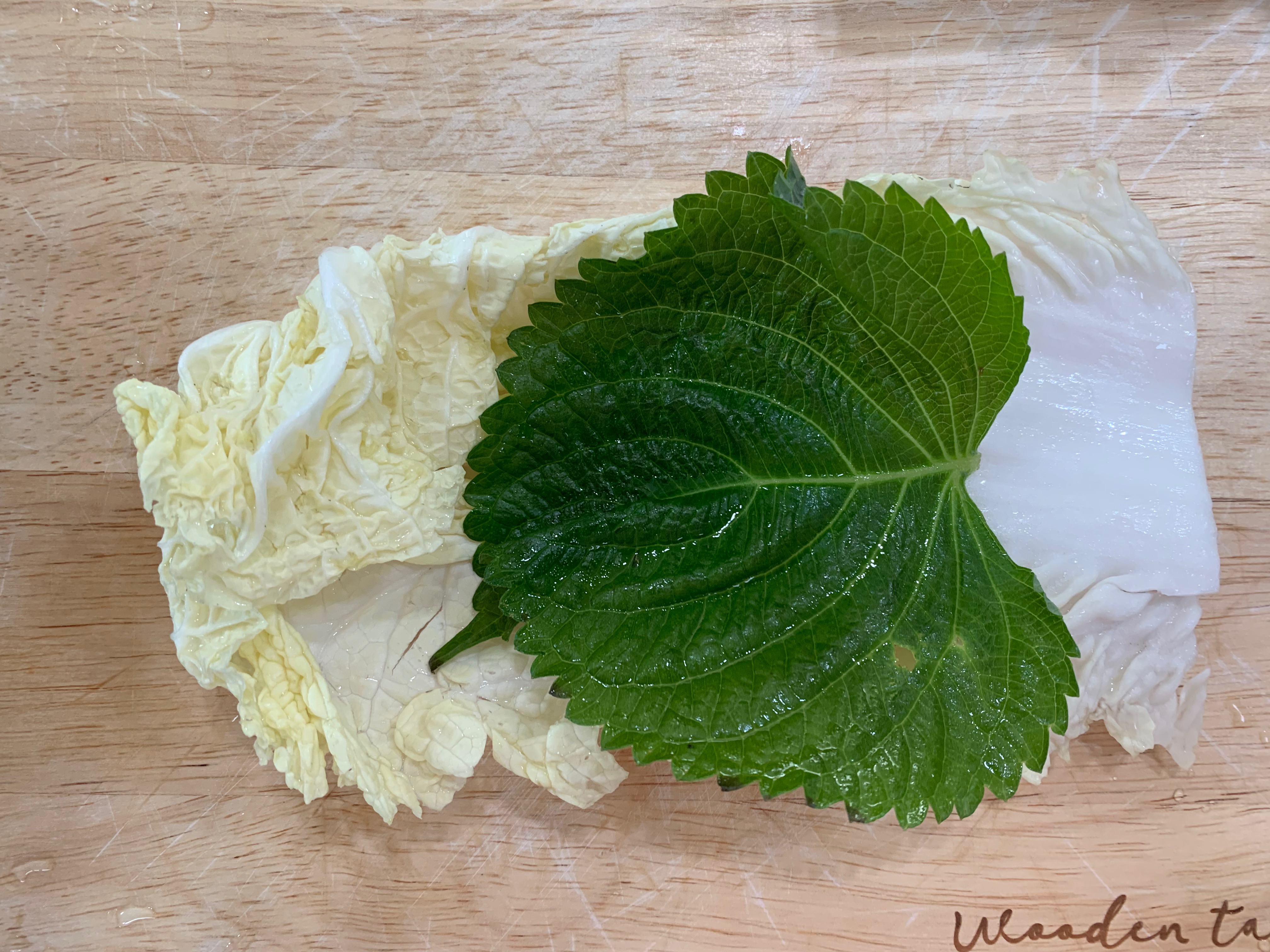 2. 재료 준비하기 소고기는 키친타월로 핏물 제거해주기, 도마에 배추 - 깻잎 - 소고기 - 배추 순으로 재료 쌓은 후 쌓은 재료를