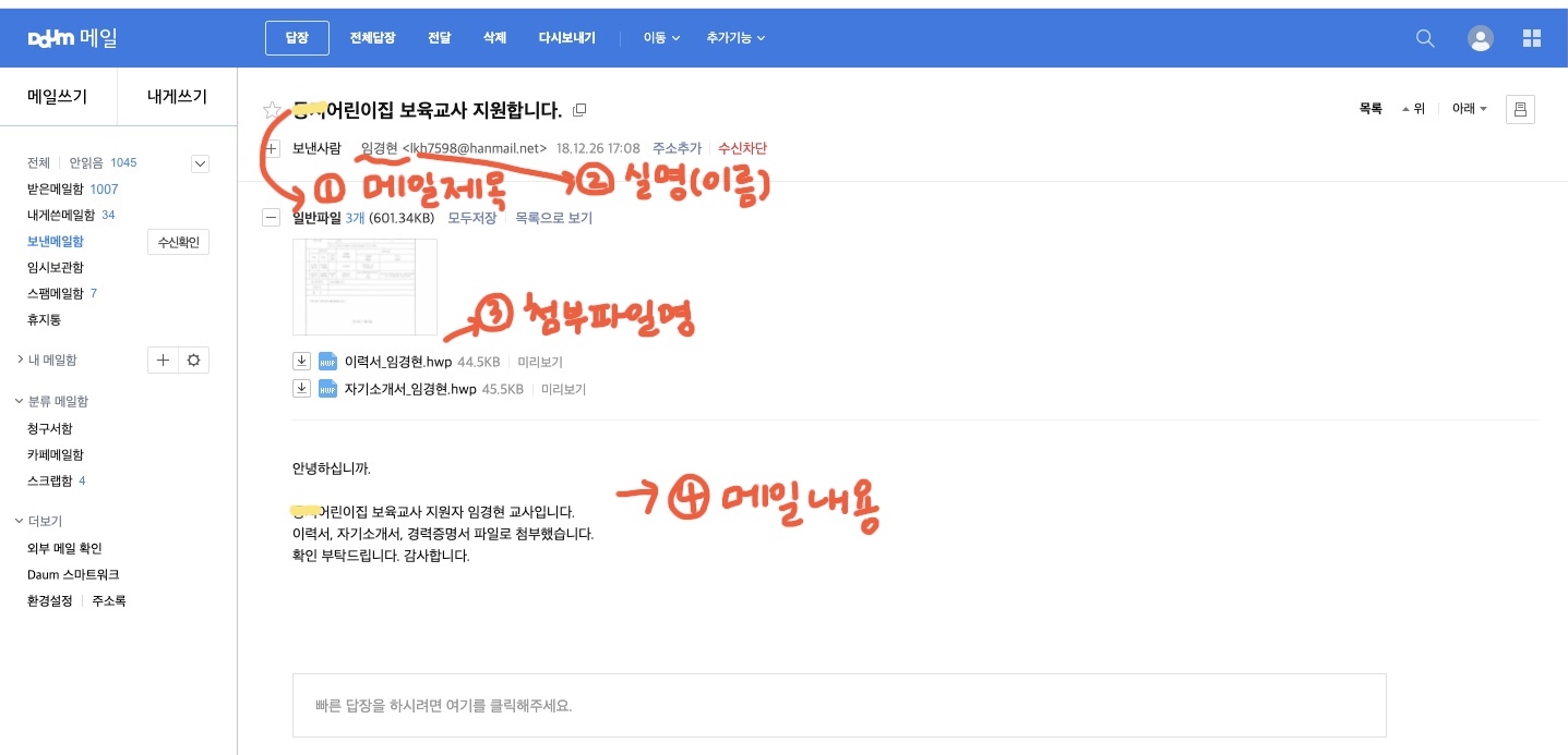어린이집자기소개서, 어린이집이력서 쓰는 방법을 이메일로 지원할 때 어려워하시는 분들이 계셔서 제가 예전에 메일 보냈던 것을 캡쳐했습니다. 저는 대학다닐 때 취업과 관련된 강의를 들은 적이 있어서 도움을 많이 받았었습니다.