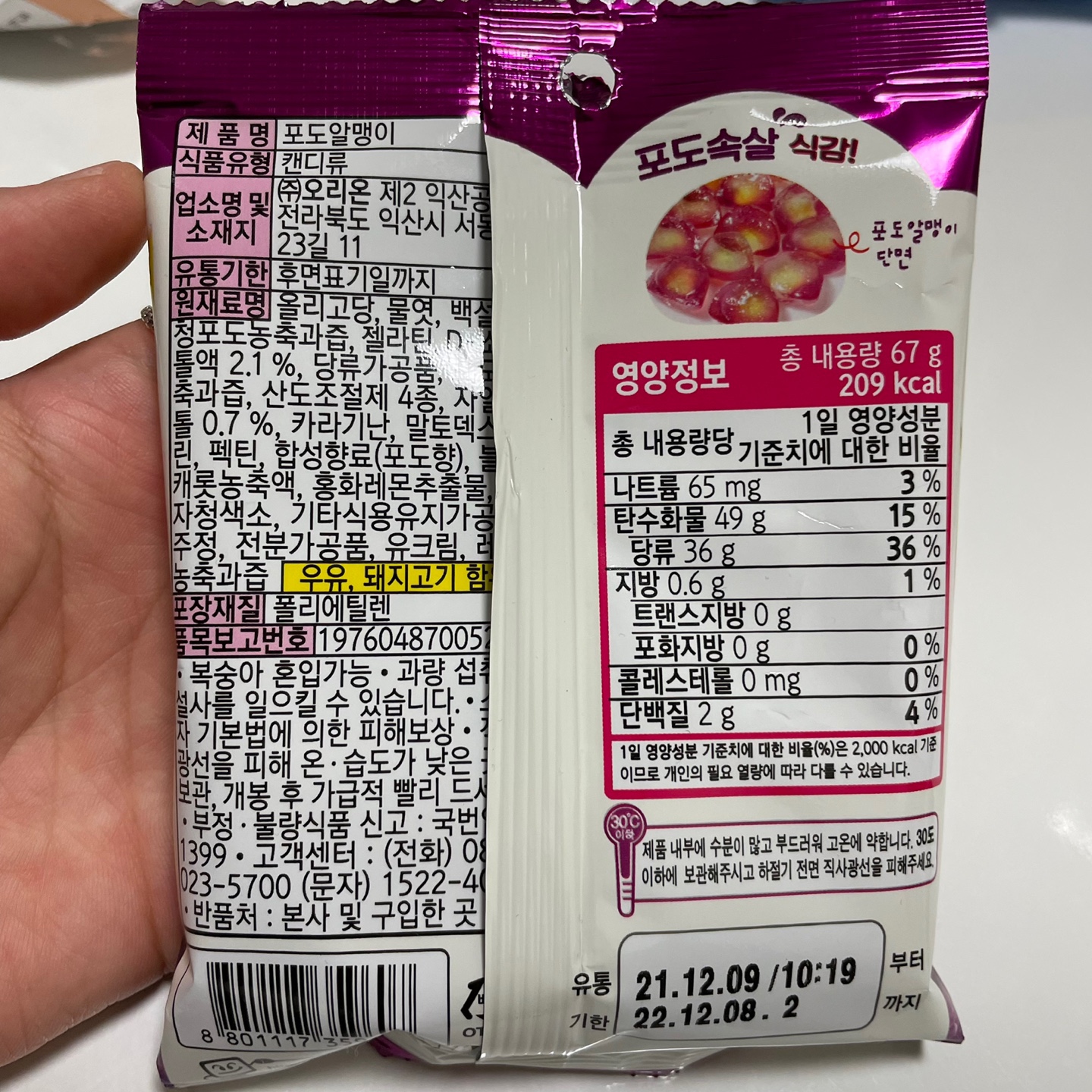 포도알맹이 젤리! 편의점에서 구입했고 67g에 1200원 가격에 구입했습니다.