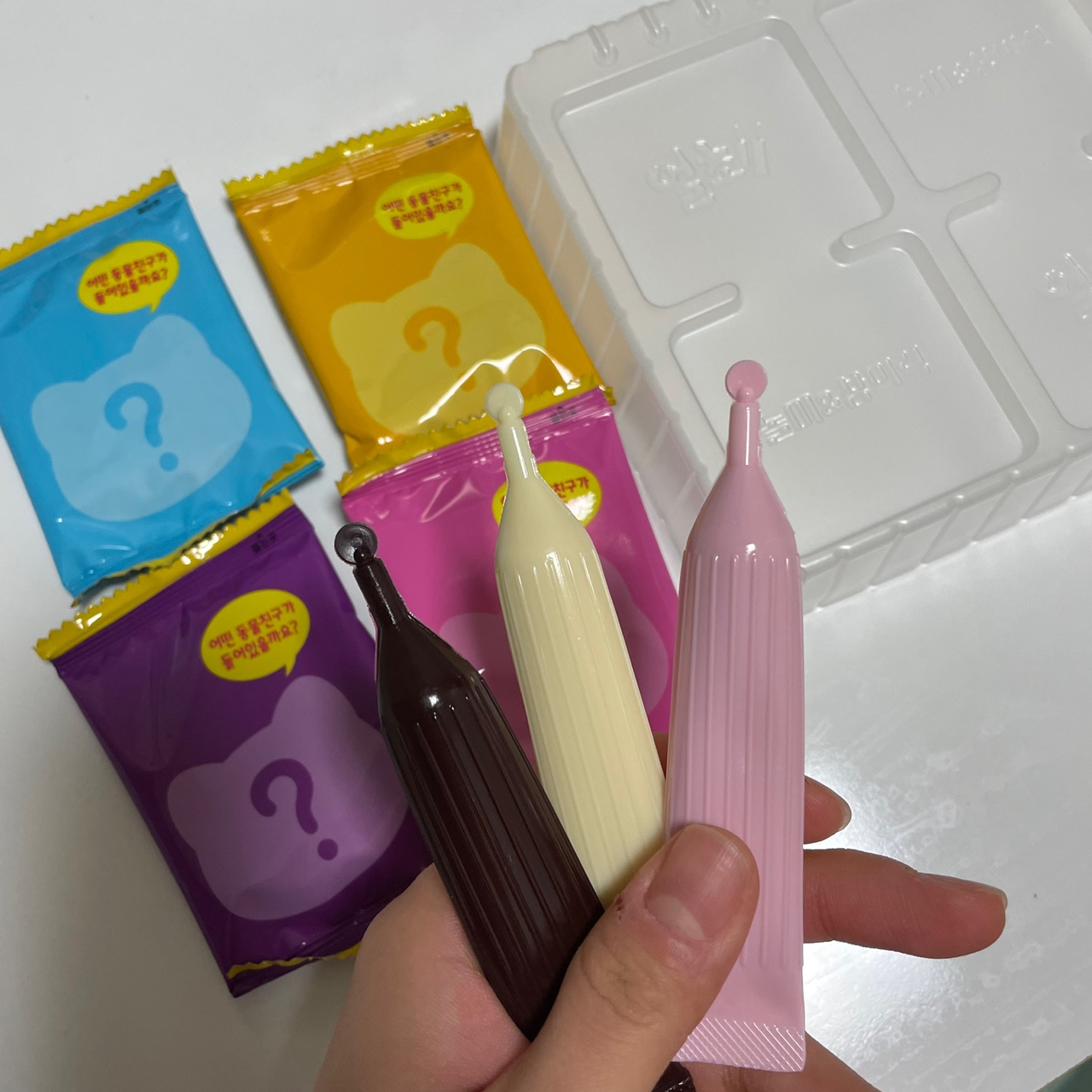 비스켓이 봉지에 각자 담겨있고 랜덤으로 고를 수 있다. 그리고 화이트, 딸기, 초콜릿 세가지의 초콜릿이 들어있다.