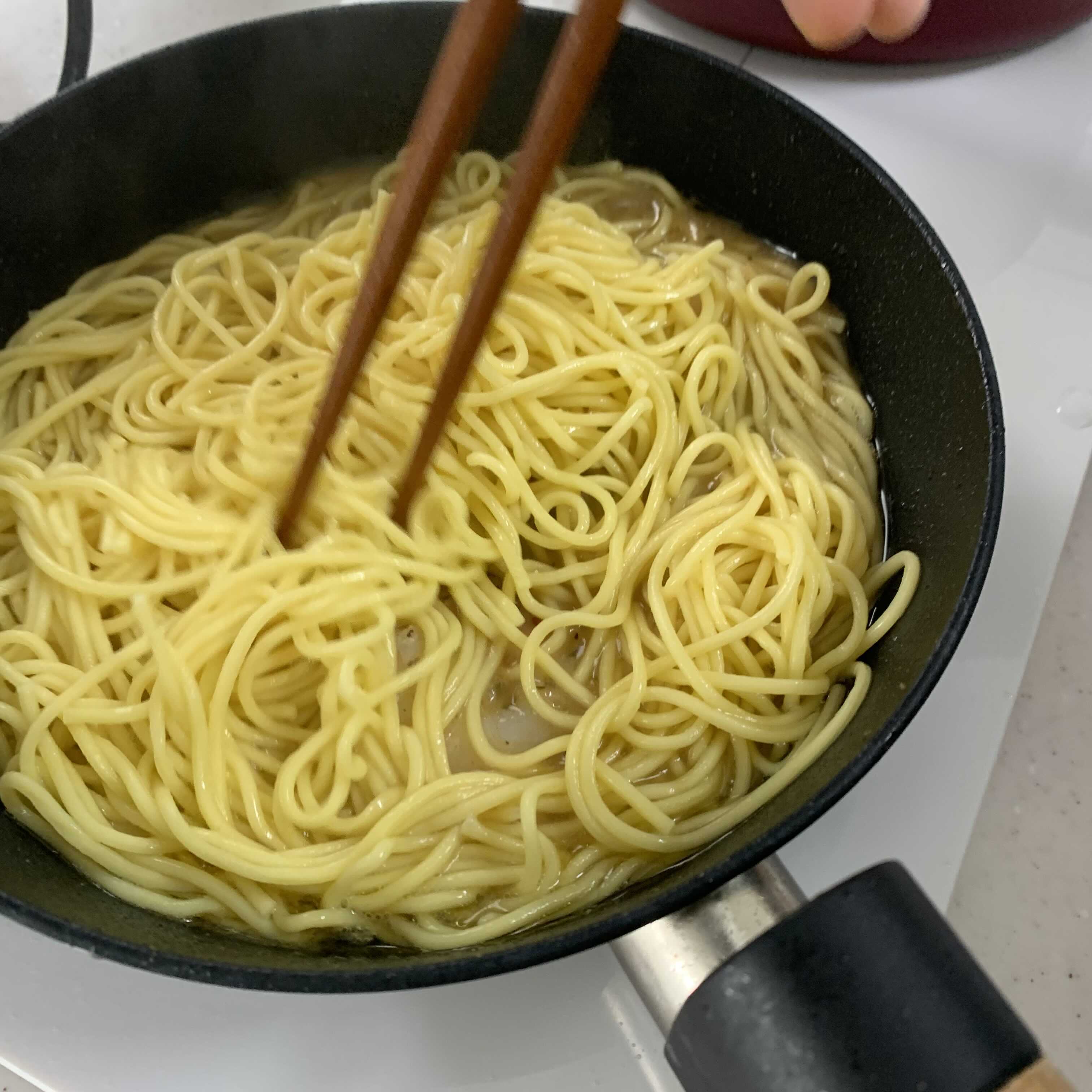 4. 2에 삶은 면과 솟, 면수 또는 물 50ml를 넣고 중불에서 1분 30초간 섞어가며 볶아주세요.