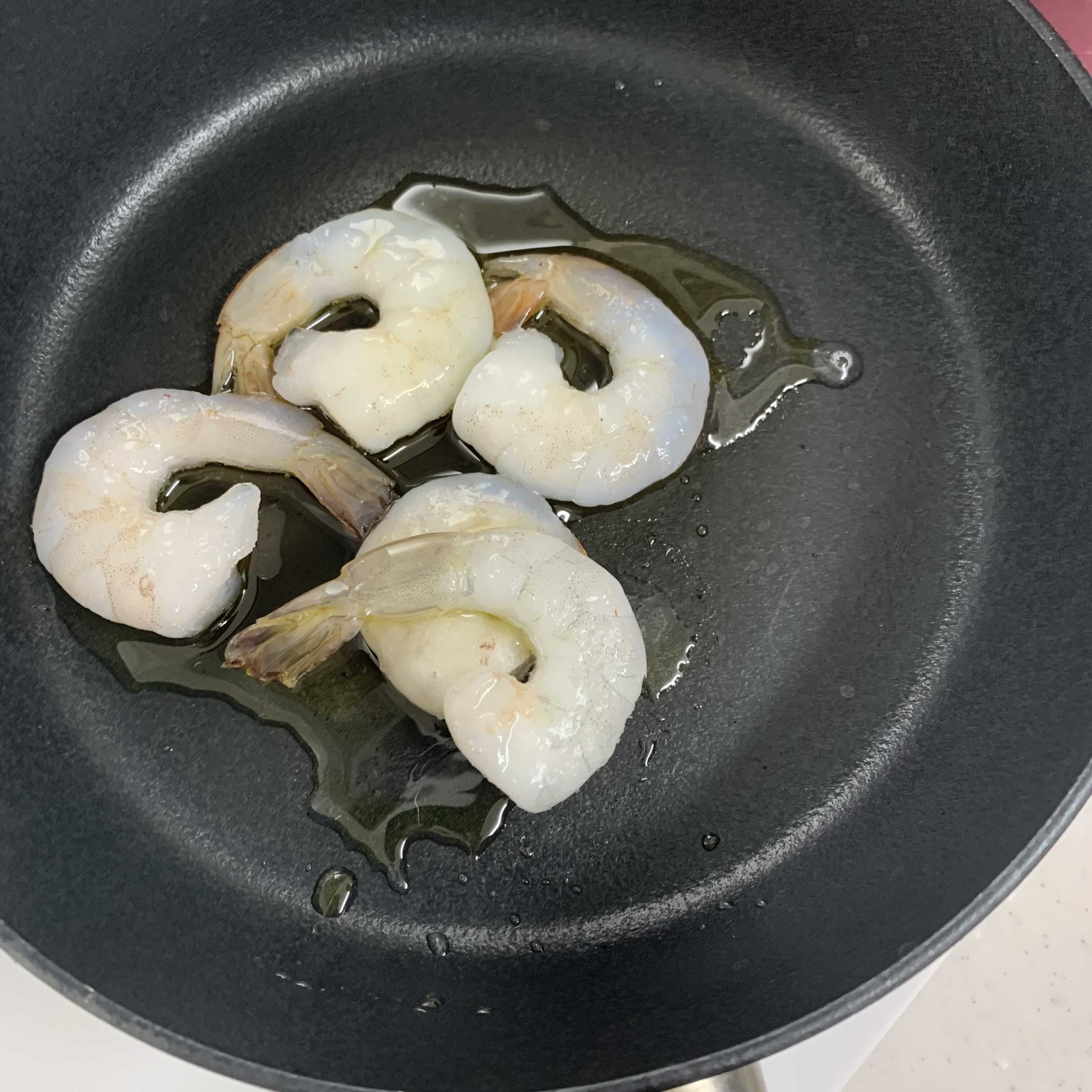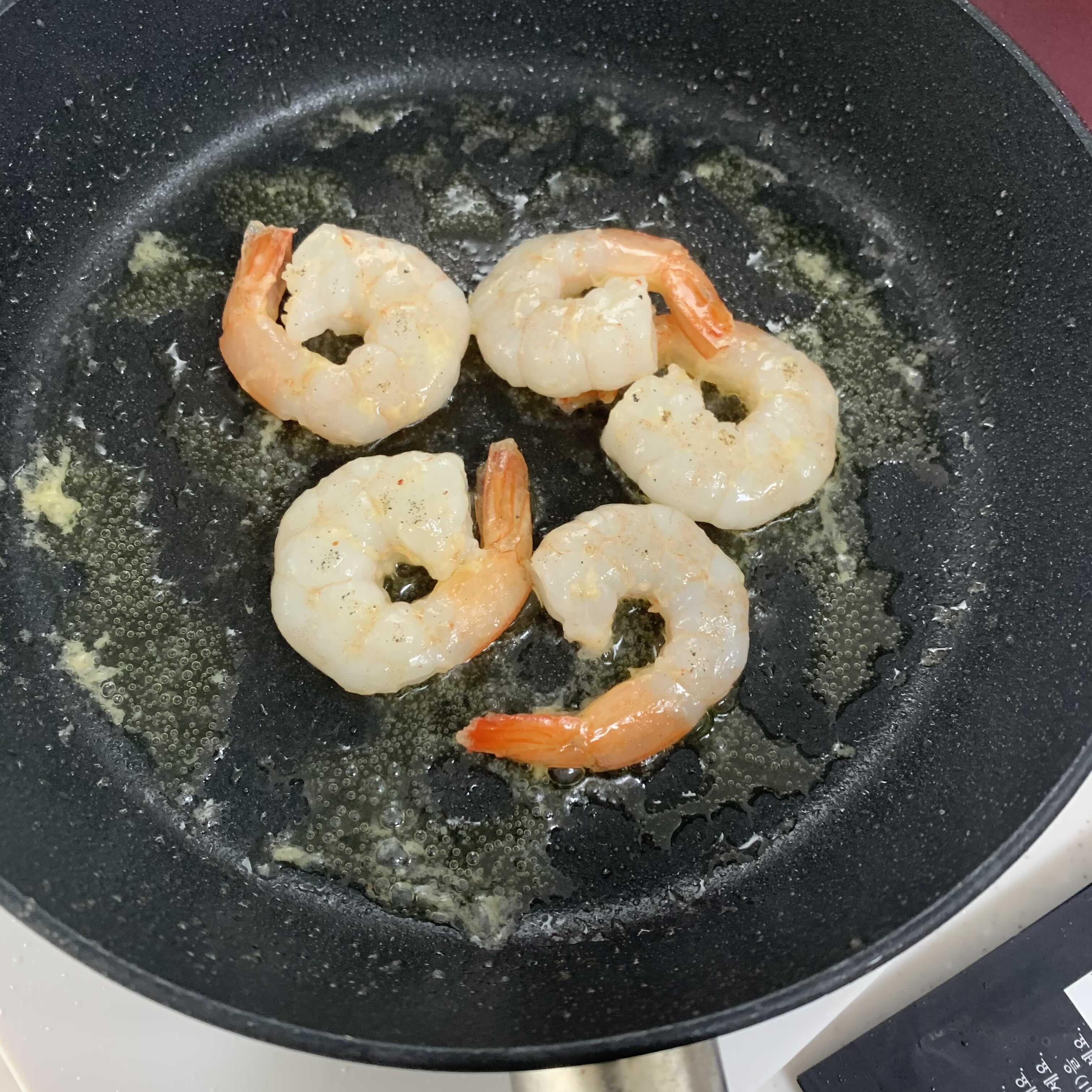 2. 팬에 올리브오일과 해동된 새우를 넣고 1분 정도 볶아주세요.