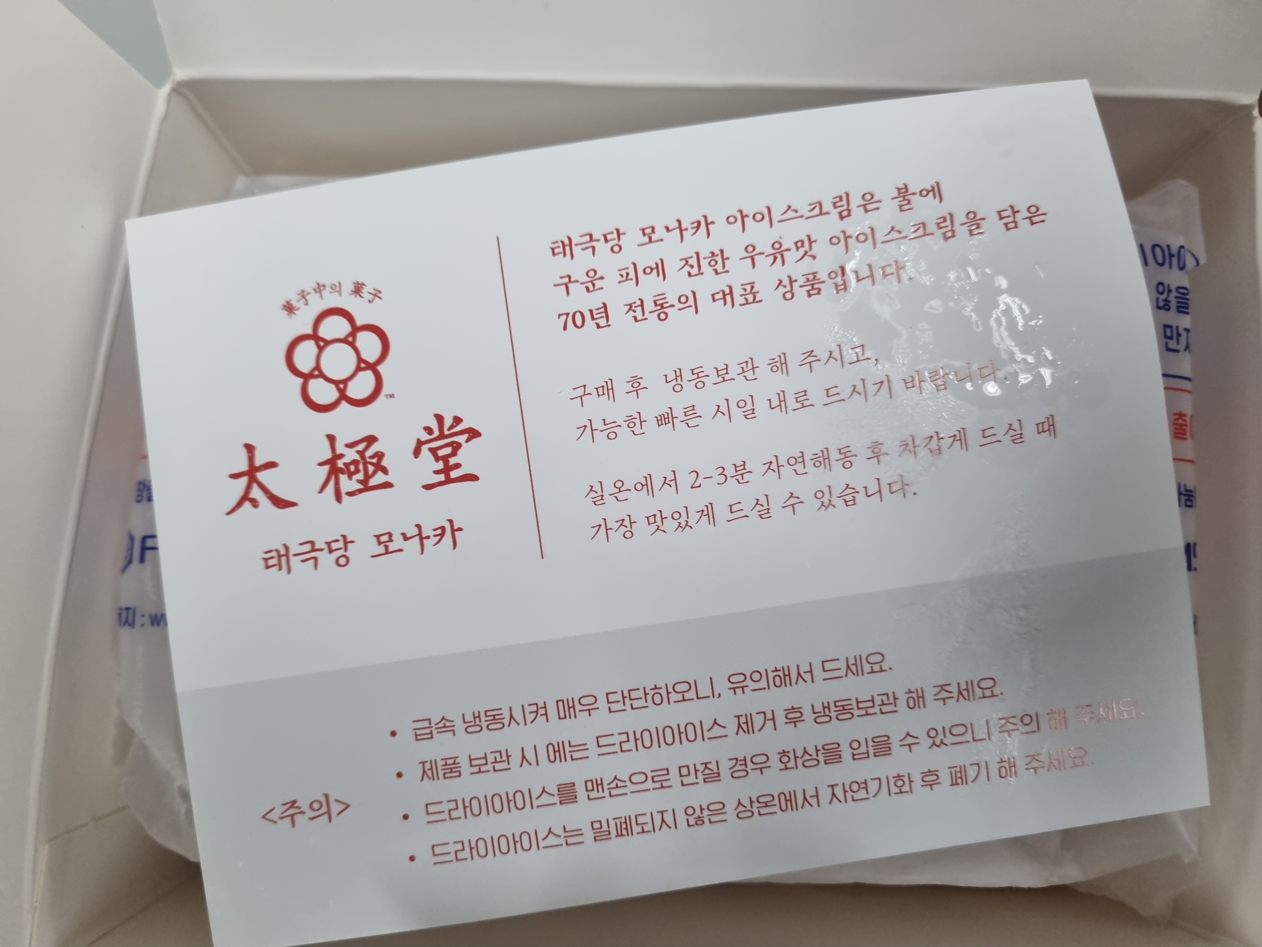 박스를 열면 주의사항이 적혀있습니다! 구매 후 냉동보관 해주시고, 가능한 빠른 시일 내로 드셔야합니다!