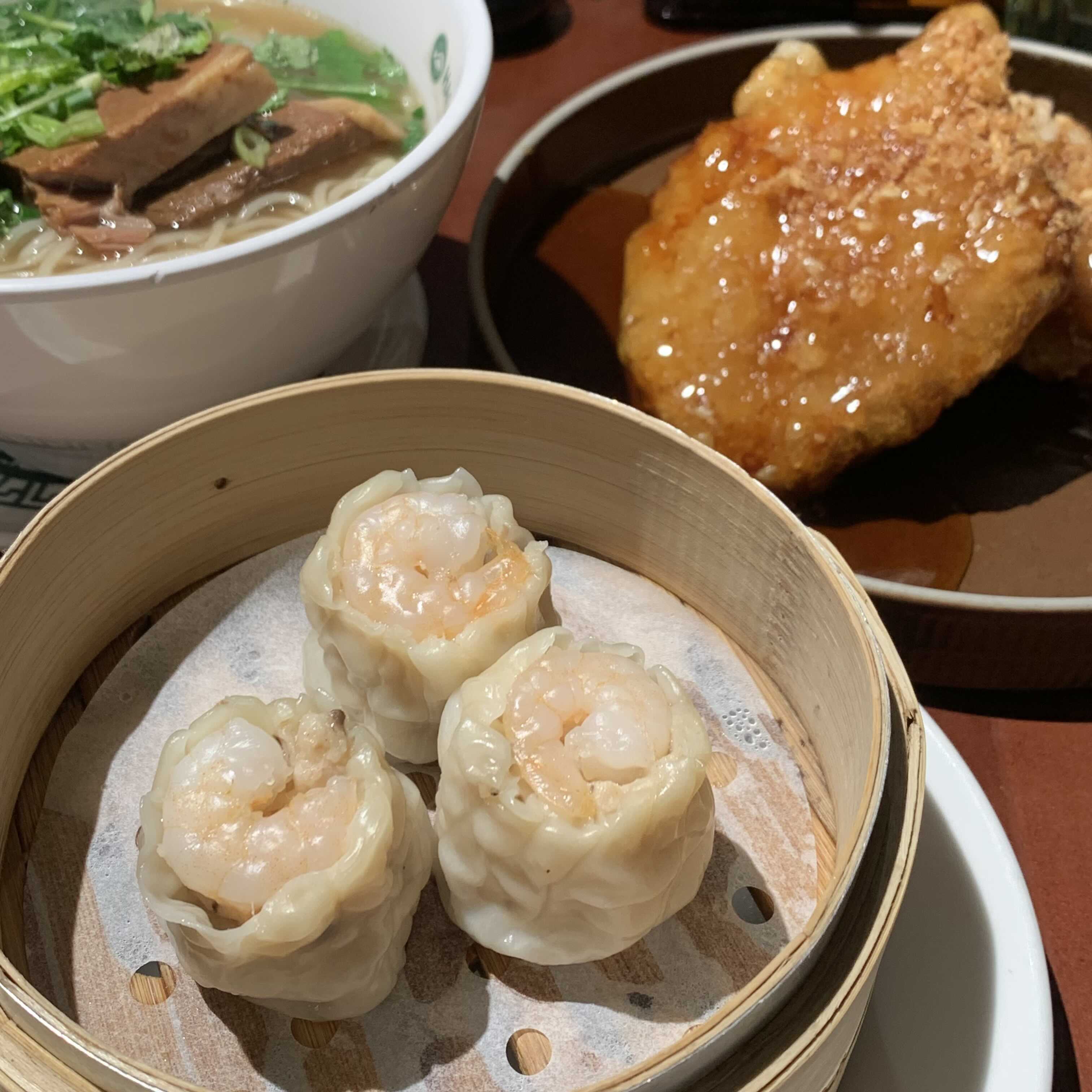 쇼마이(3피스), 마늘칩 꿔바로우, 맑은 우육탕면, 닭고기 조림 솥밥을 주문했습니다!
