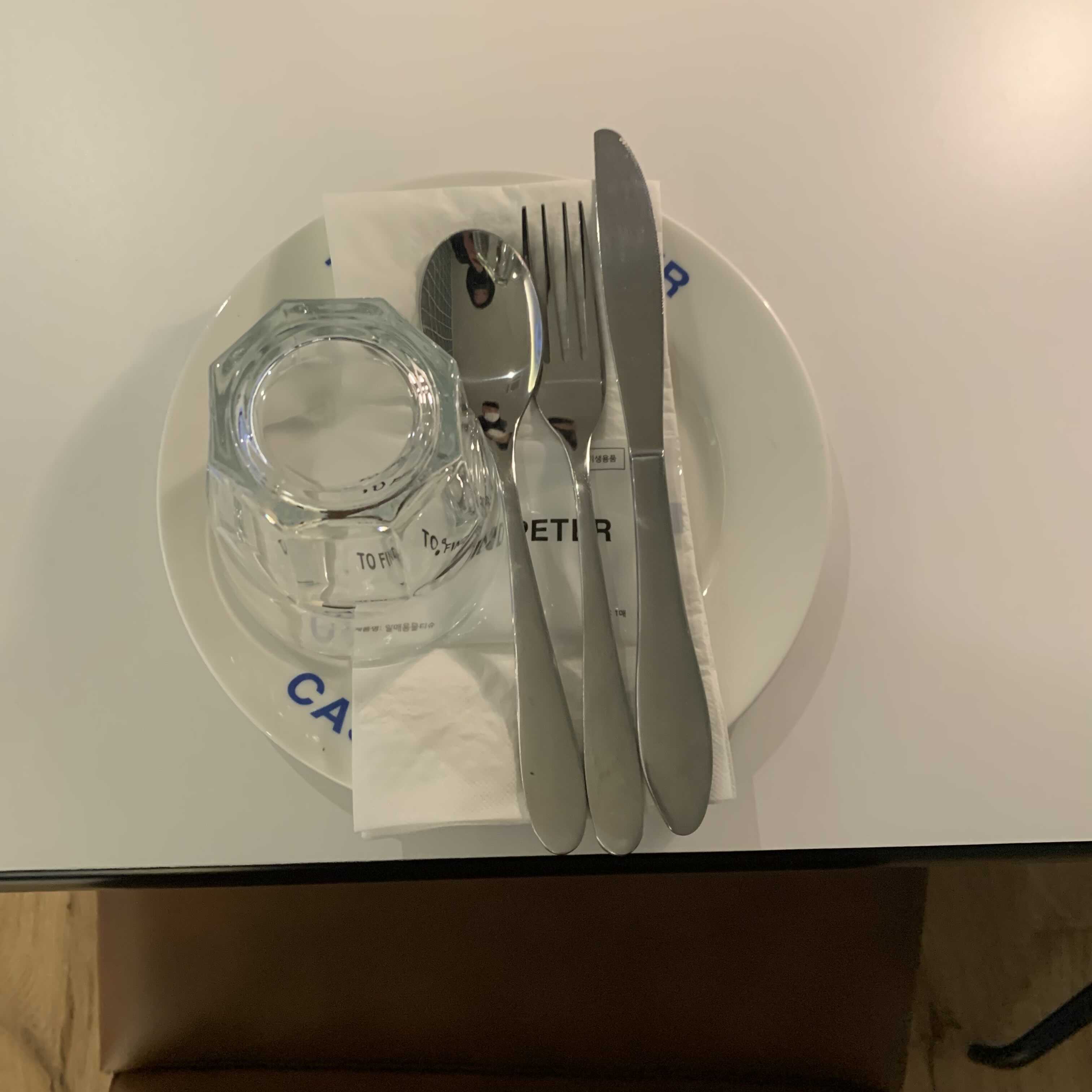 편한 자리를 앉으면 물을 가져다주세요. 식탁에 메뉴판과 가지런히 접시와 컵등이 준비되어 있습니다.