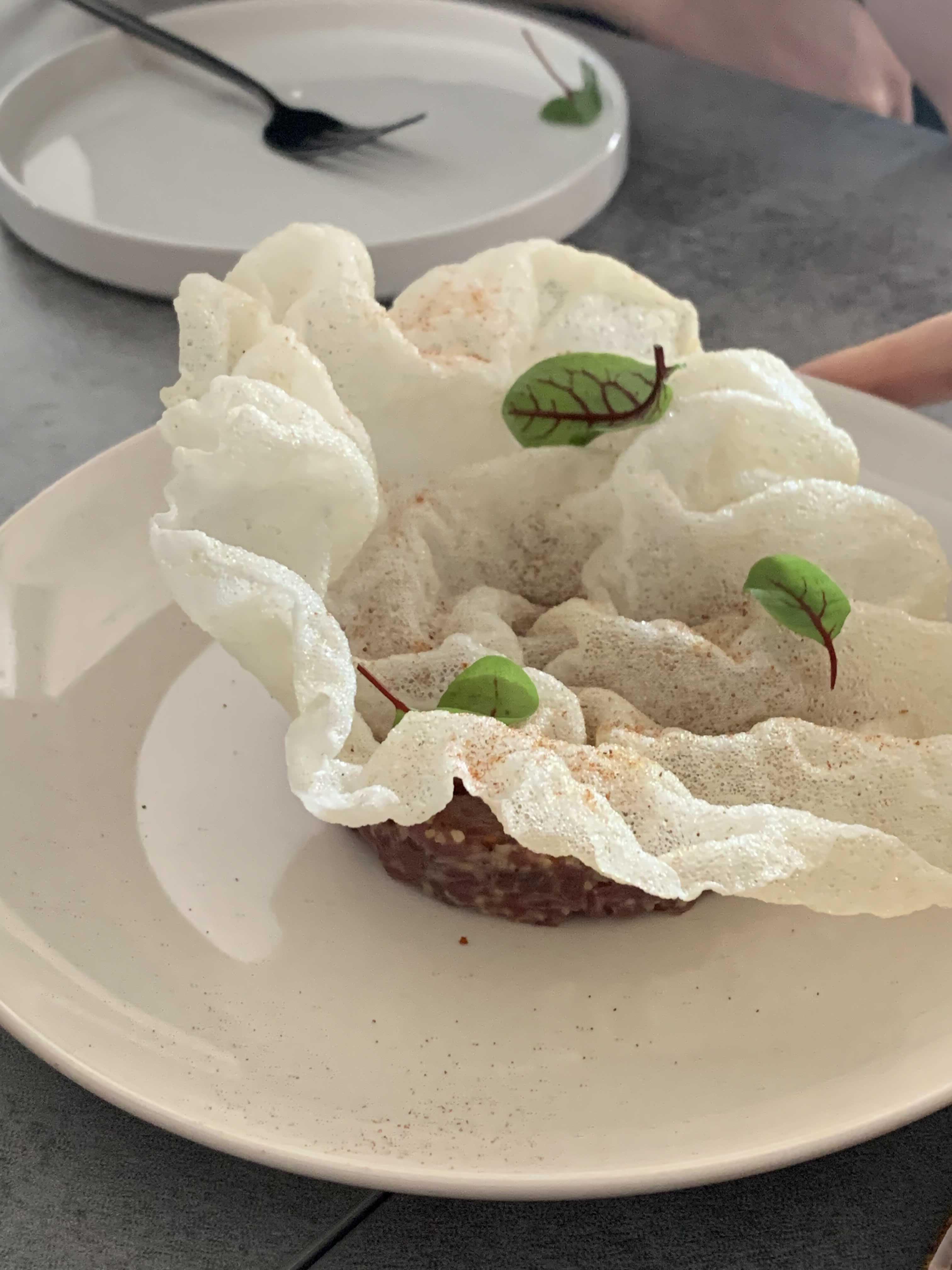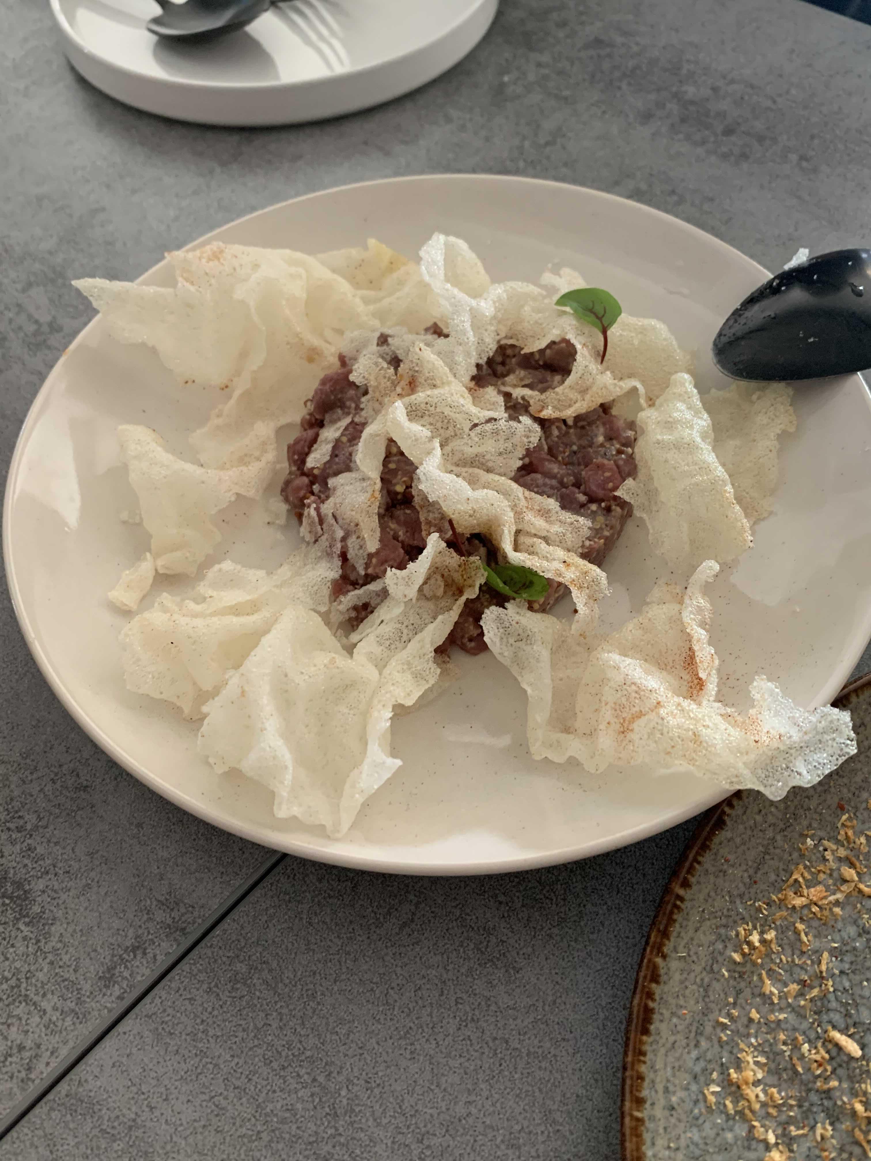 라이스페이퍼 칩을 숟가락으로 깨서 유럽식 육회랑 함께 먹을 수 있어요.