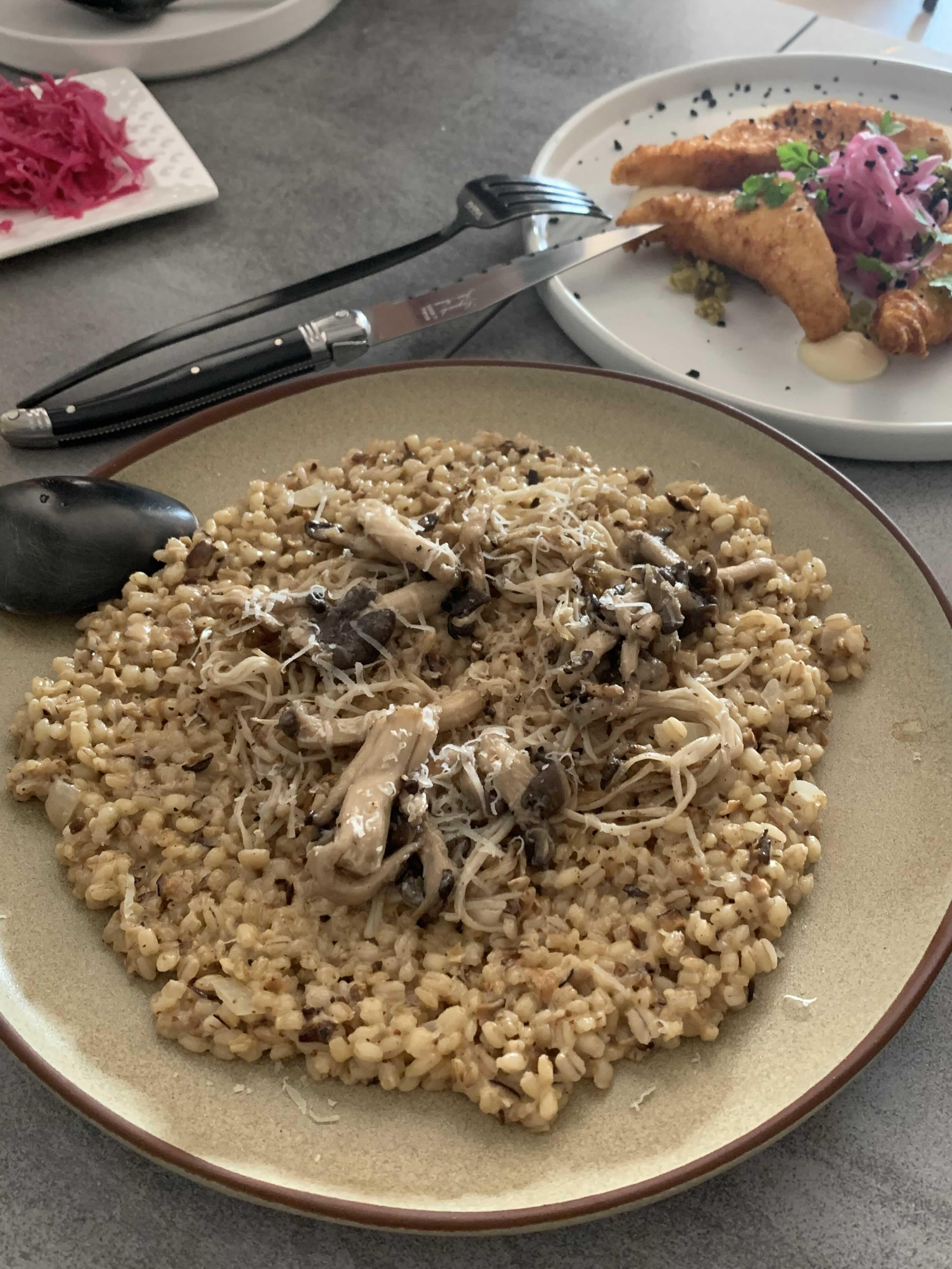 숯에 구운 버섯 & 양송이 버섯, 표고버섯으로 맏는 튁셀 버터가 들어간 버섯 크림 리조또입니다.