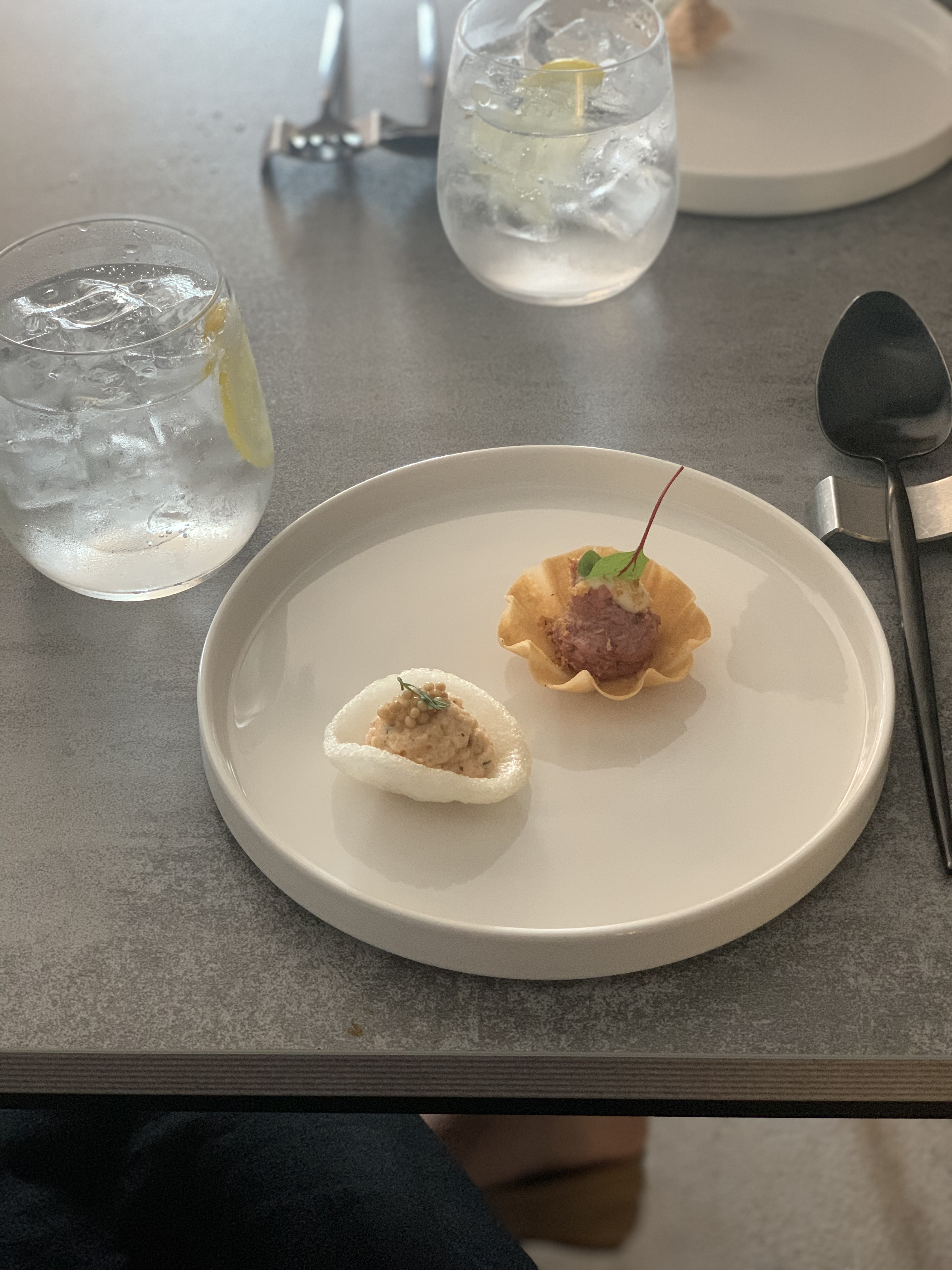 한우타르트 & 새우 타르트 2개, 한우 1++ 타르타르, 새우 타르타르, 영국식 달고기 튀김, 버섯 뒥셀 리조또,