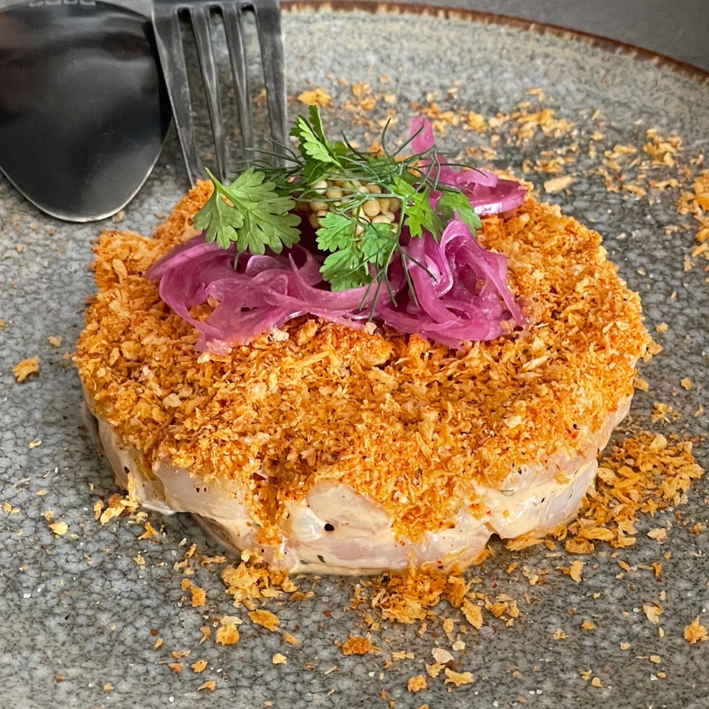 홀그레인 머스타드로 만든 시저드레싱을 버무린 유럽식 육회&라이스페이퍼 칩 입니다.