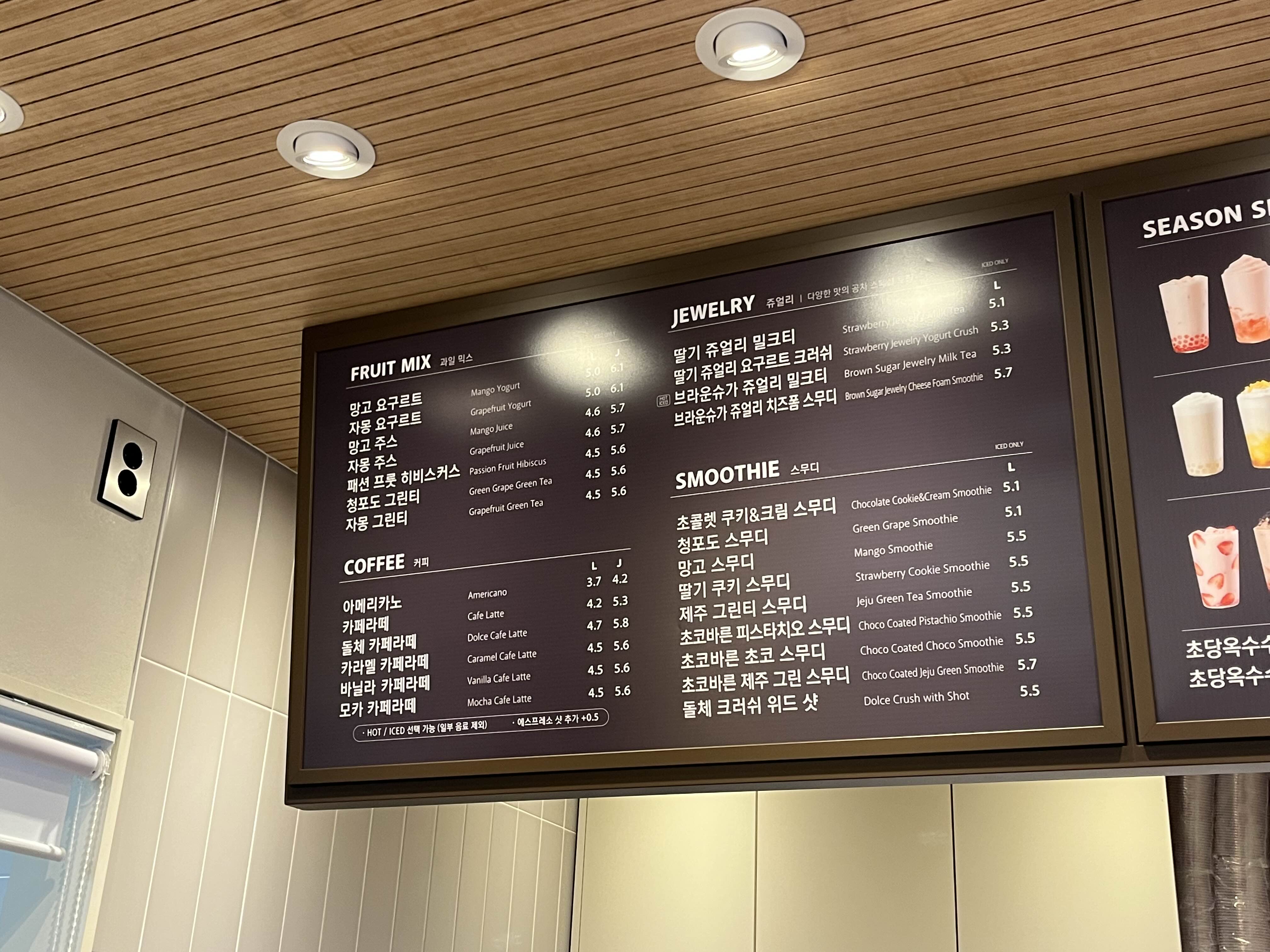 저도 다음에 납장복숭아 쥬얼리 밀크티로 먹고싶네요! :) 가격대는 5천원~6천원 정도입니다.