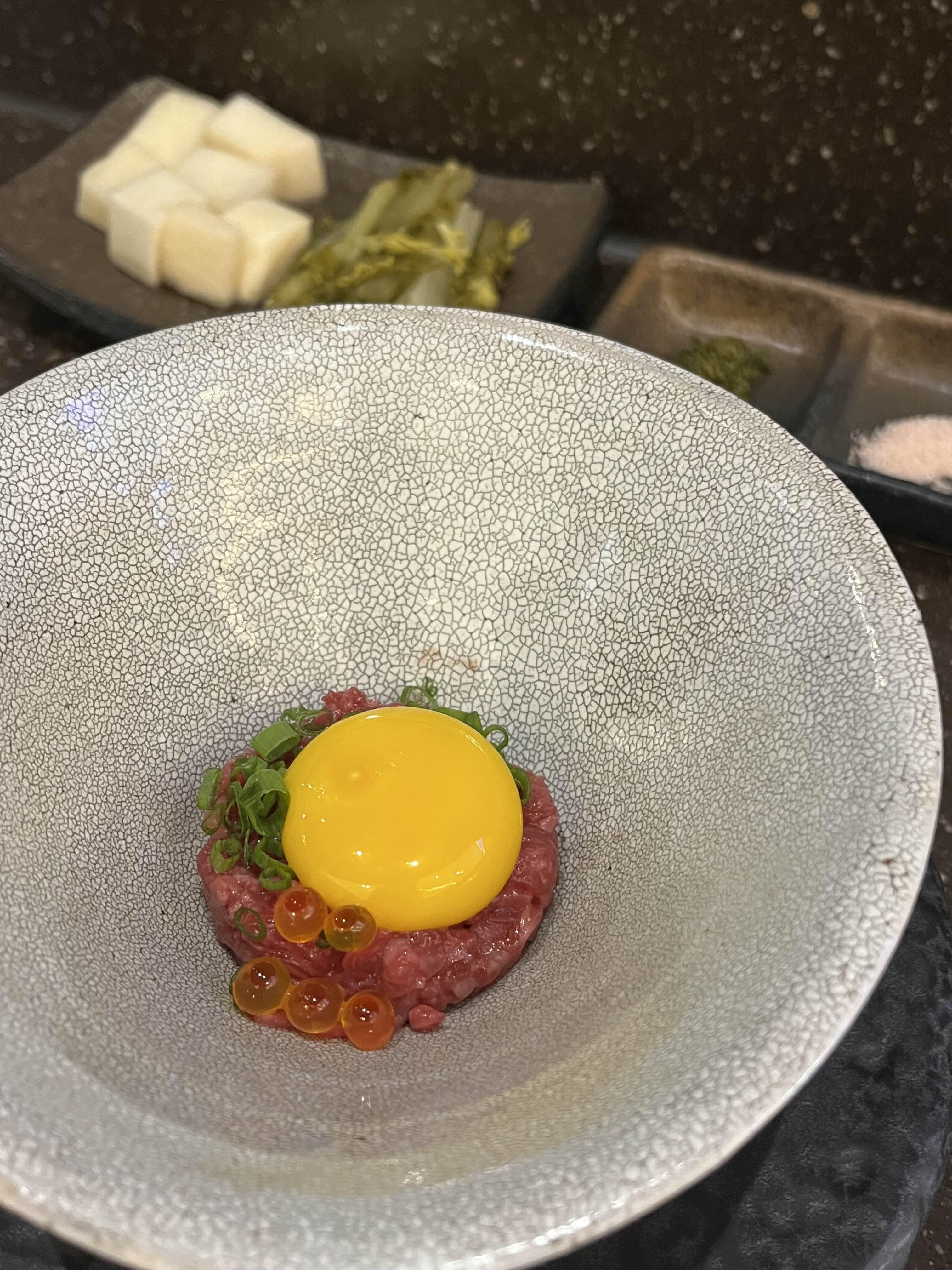 첫 메뉴는 연어알을 곁들인 육회입니다. 진짜 육회... 고소하고 너무 맛있었어요...
