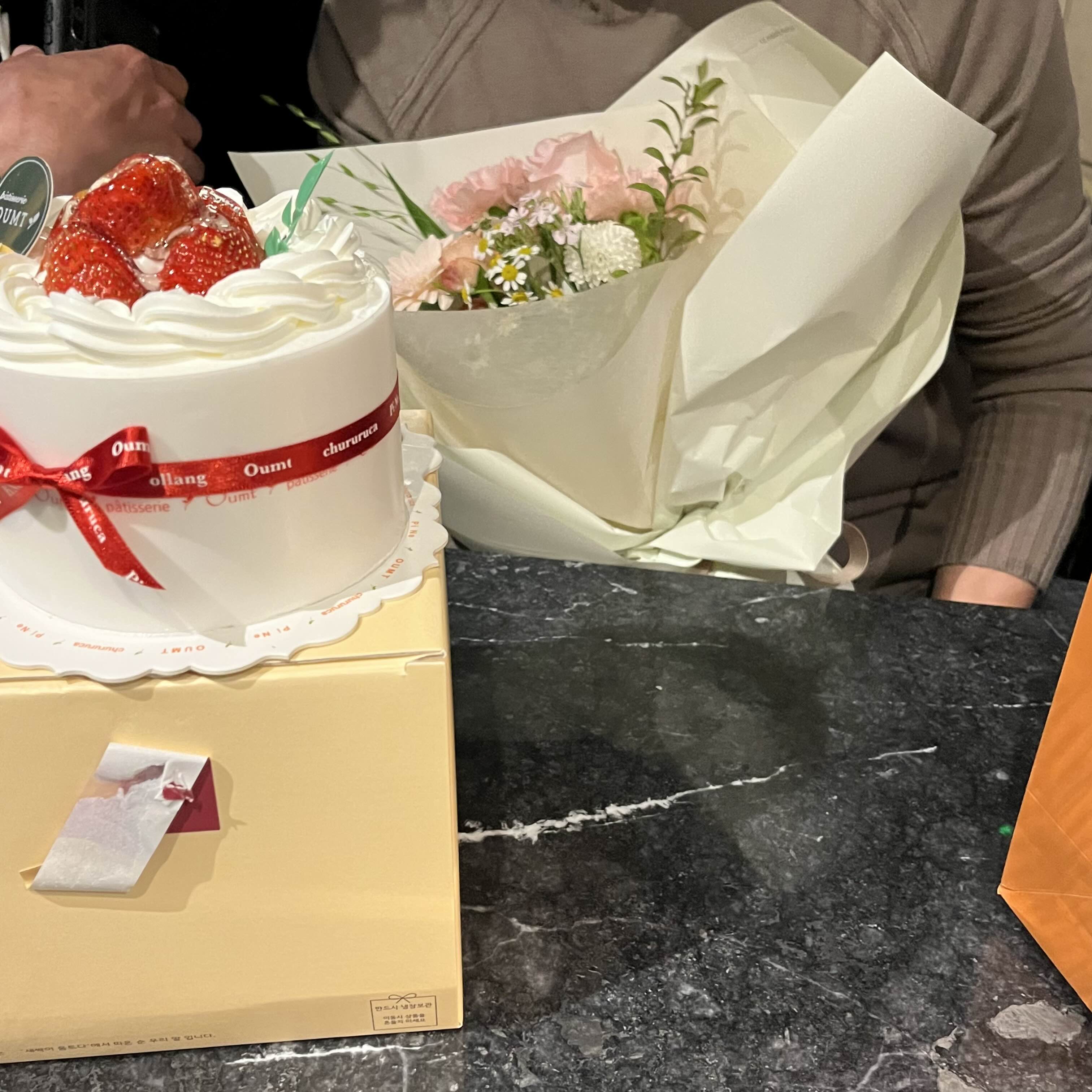 꽃과 케이크 함께 선물했는데 좋아하시네요. 생일때는 진짜 케이크랑 꽃이 빠지면 안되겠죠~~