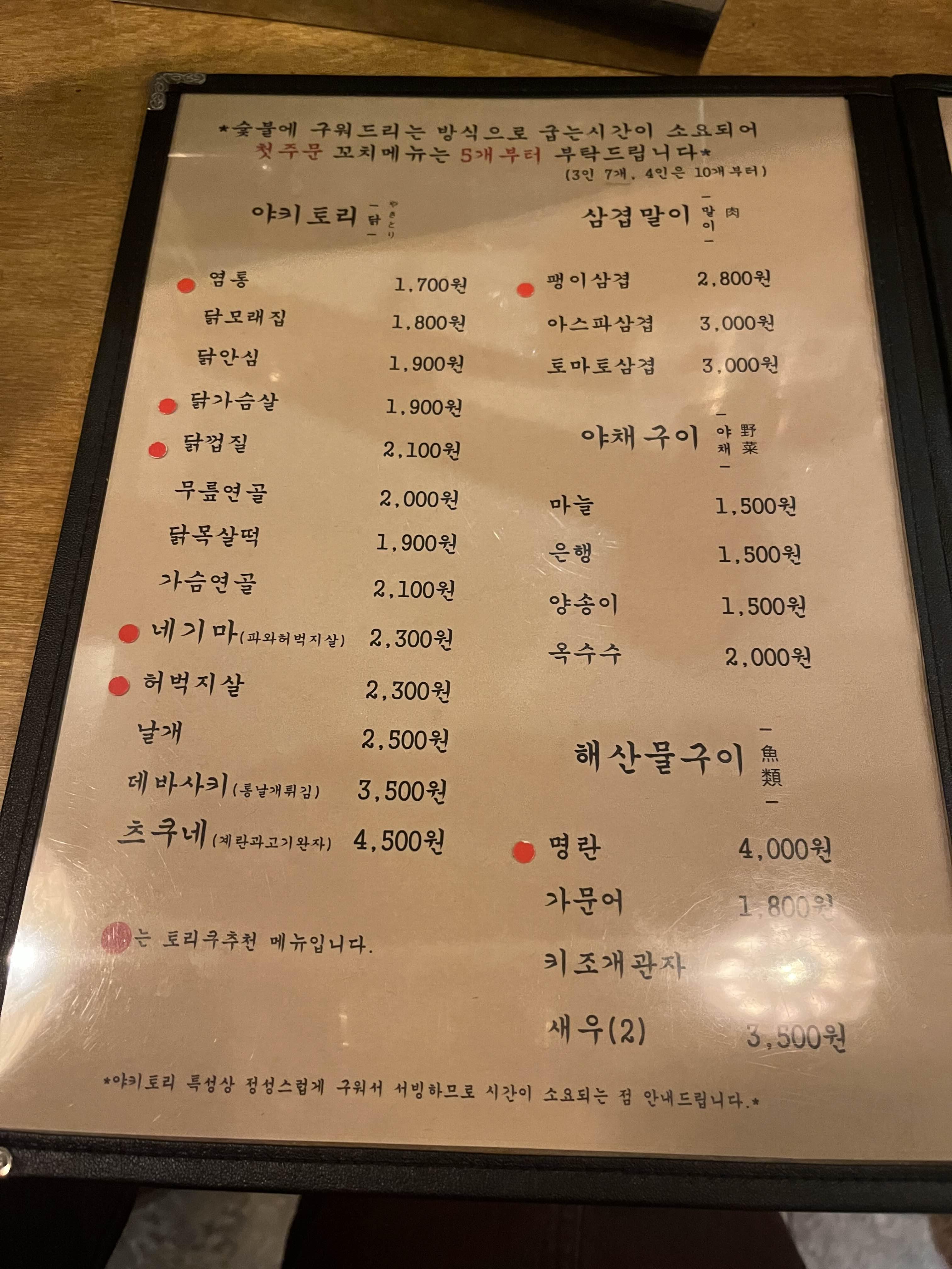 저는 네기마, 키조개관자, 허벅지살, 토마토삼겹, 닭모래집, 유자생맥주, 우롱하이볼을 주문했습니다 :)