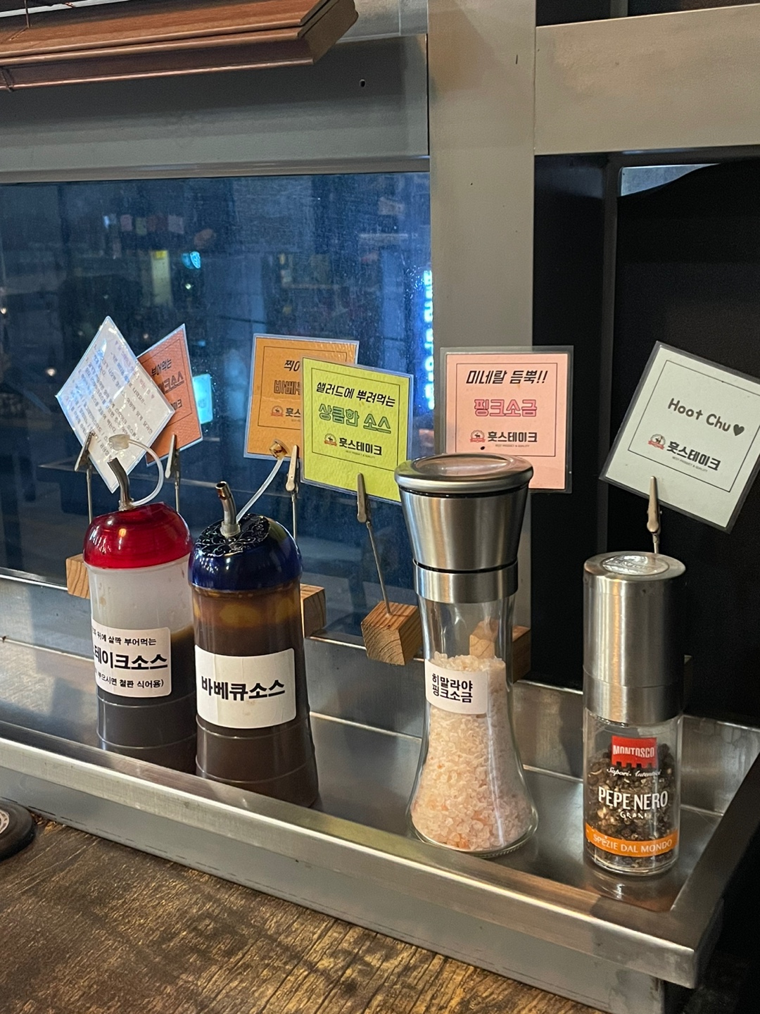 테이블마다 소스와 소금 등 취향에 맞게 먹을 수 있도록 준비되어있습니다.