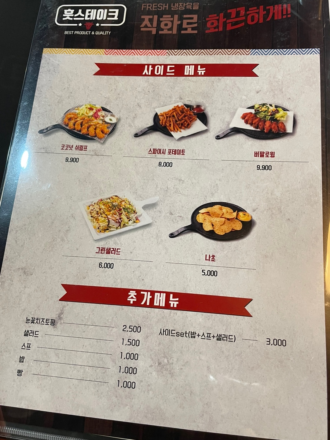 메뉴입니다. 저는 등심스테이크 300g, 사이드 세트(샐러드+스프+밥), 콜라를 주문했습니다.