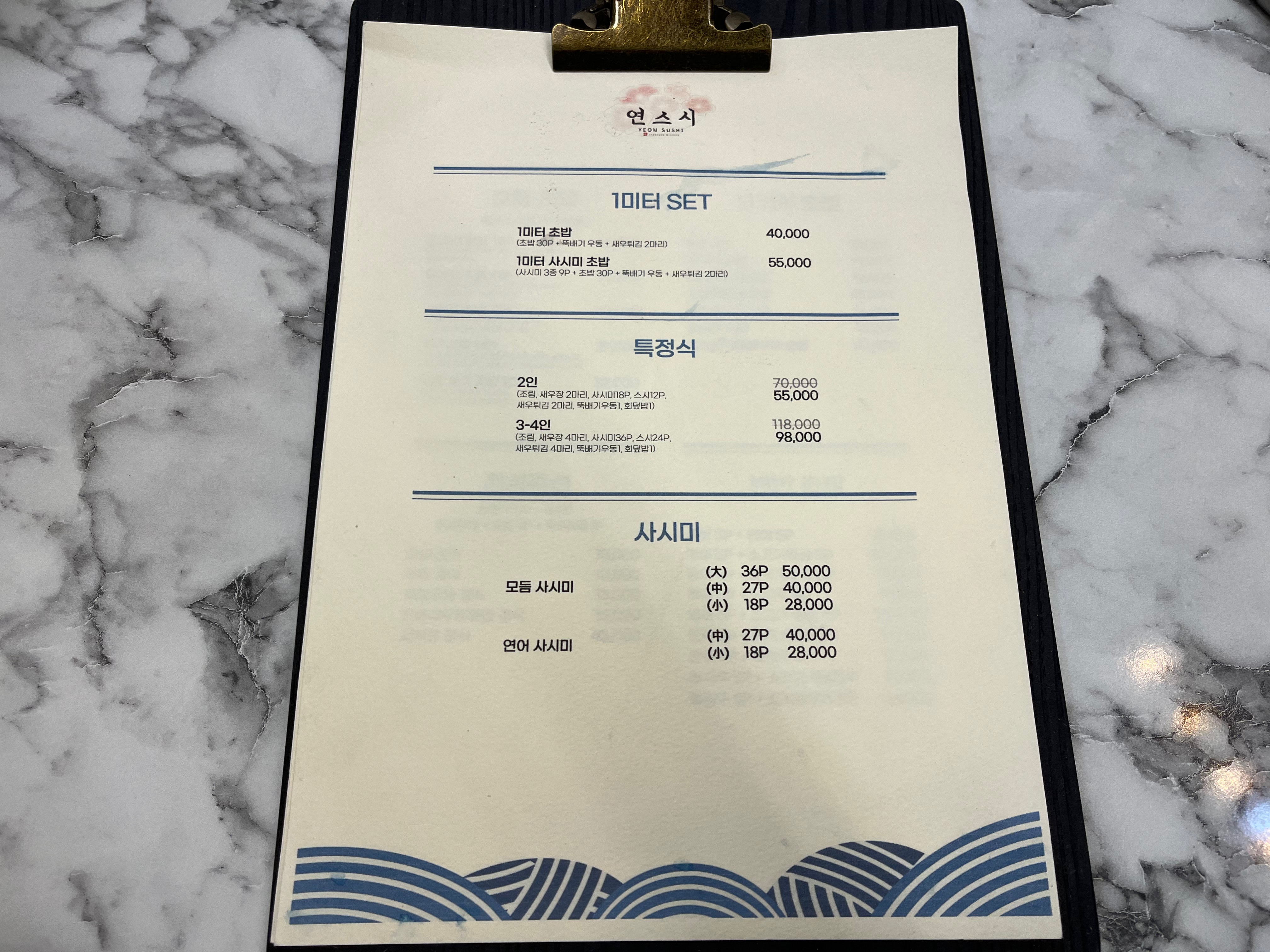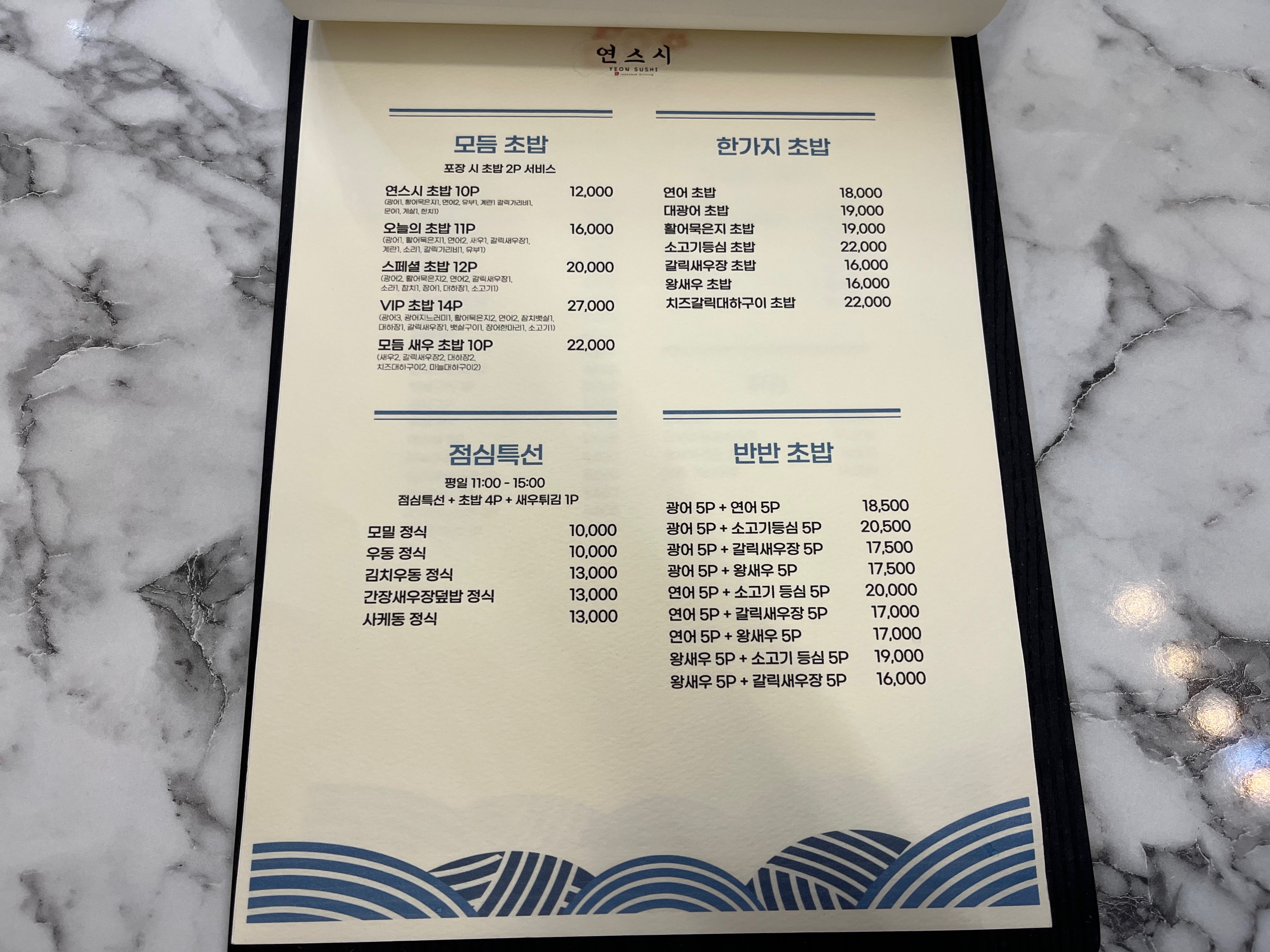 연스시 메뉴입니다. 1미터 세트가 있어서 신기했어요. 1m로 나오는 초밥 다음에 도전해보려구요!