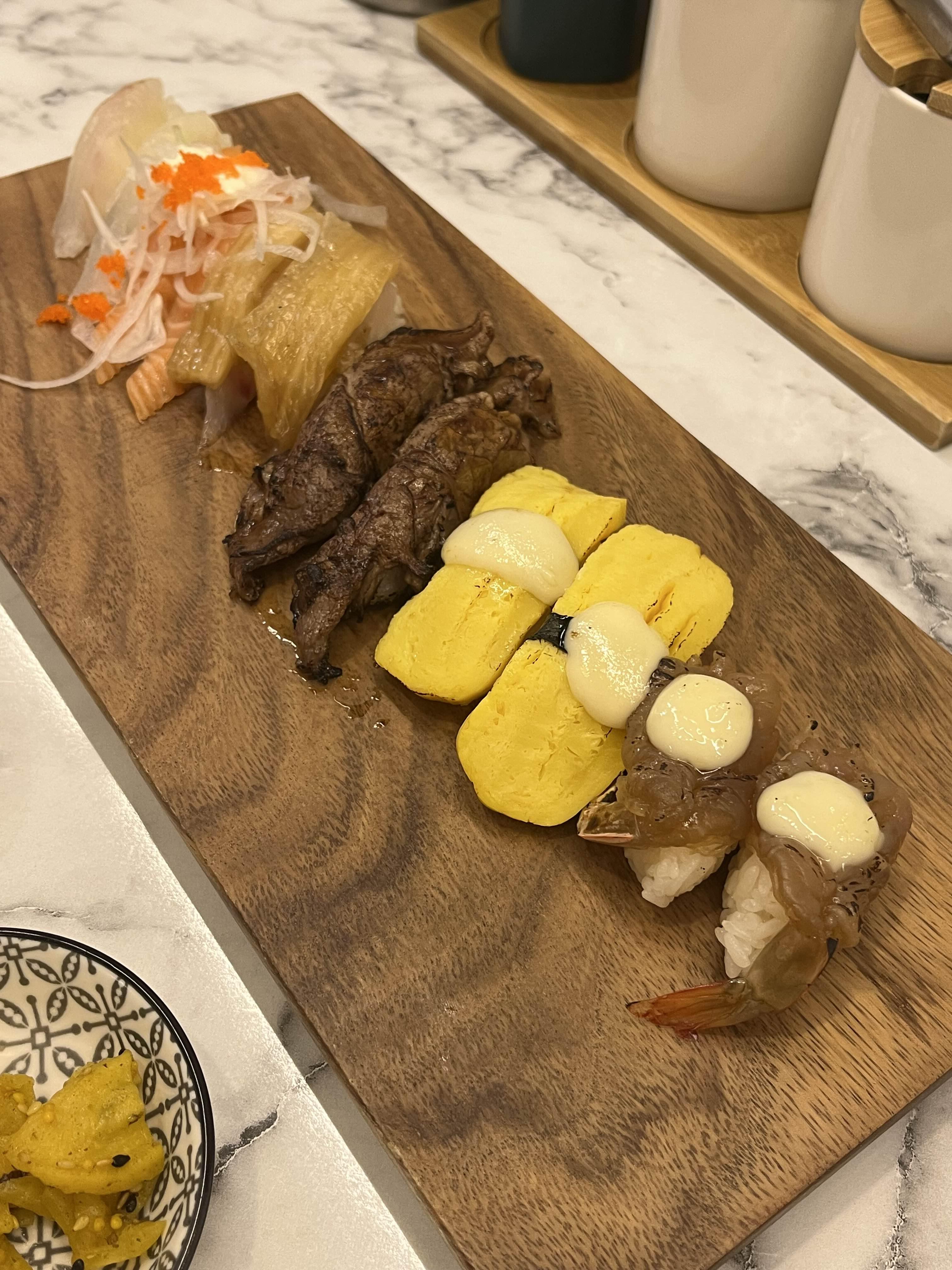 스시 12p 나왔습니다. 묵은지, 갈릭 새우장 초밥, 등심 소고기 불 초밥, 연어 등 제공되는데 갈릭소스가 달콤해서 맛있었는데