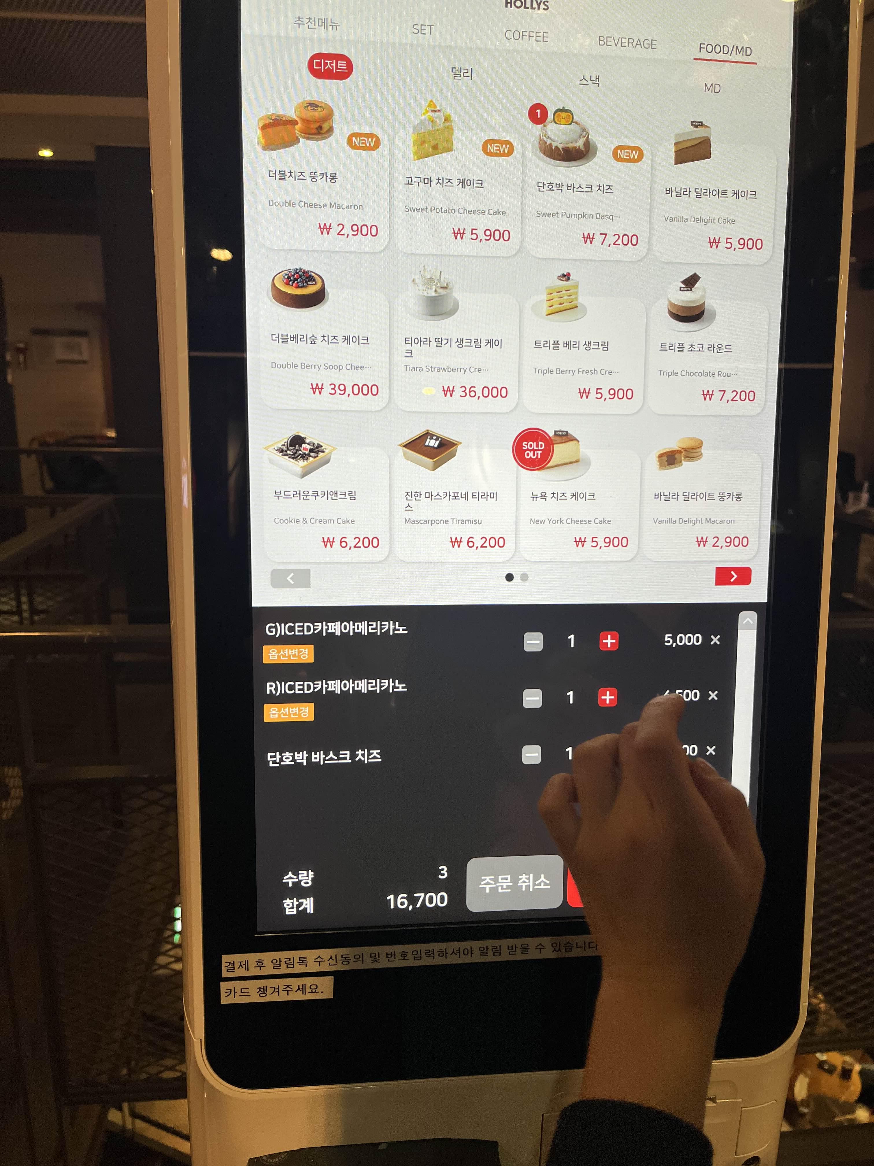 노원 할리스는 키오스크로 주문을 합니다. 저는 이렇게 3가지 메뉴를 주문해서 총 16,700원이 나왔습니다.
