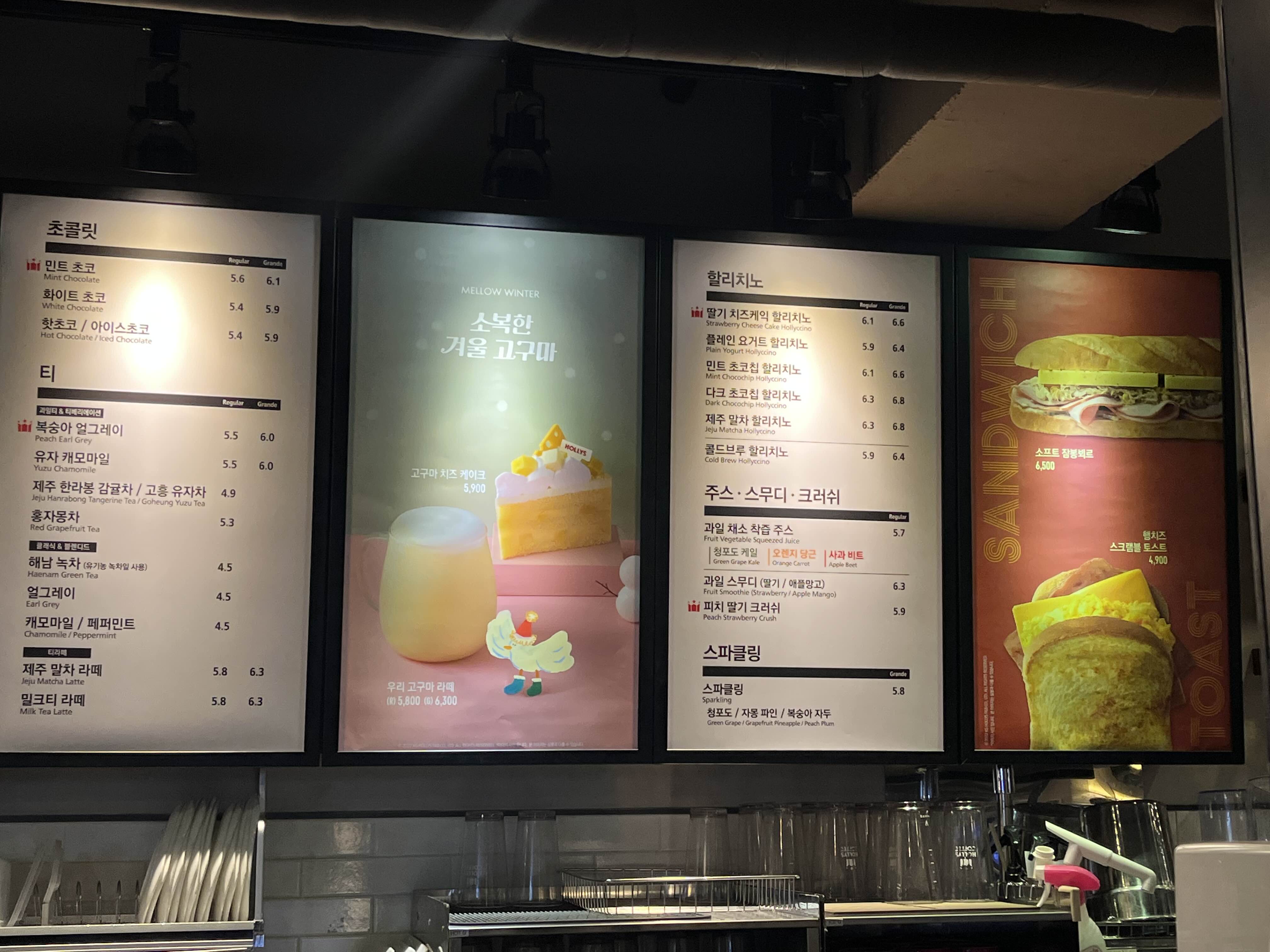 소복한 겨울 고구마로 시즌메뉴가 나온것 같습니다. 고구마 치즈케이크, 우리 고구마라떼도 있네요.
