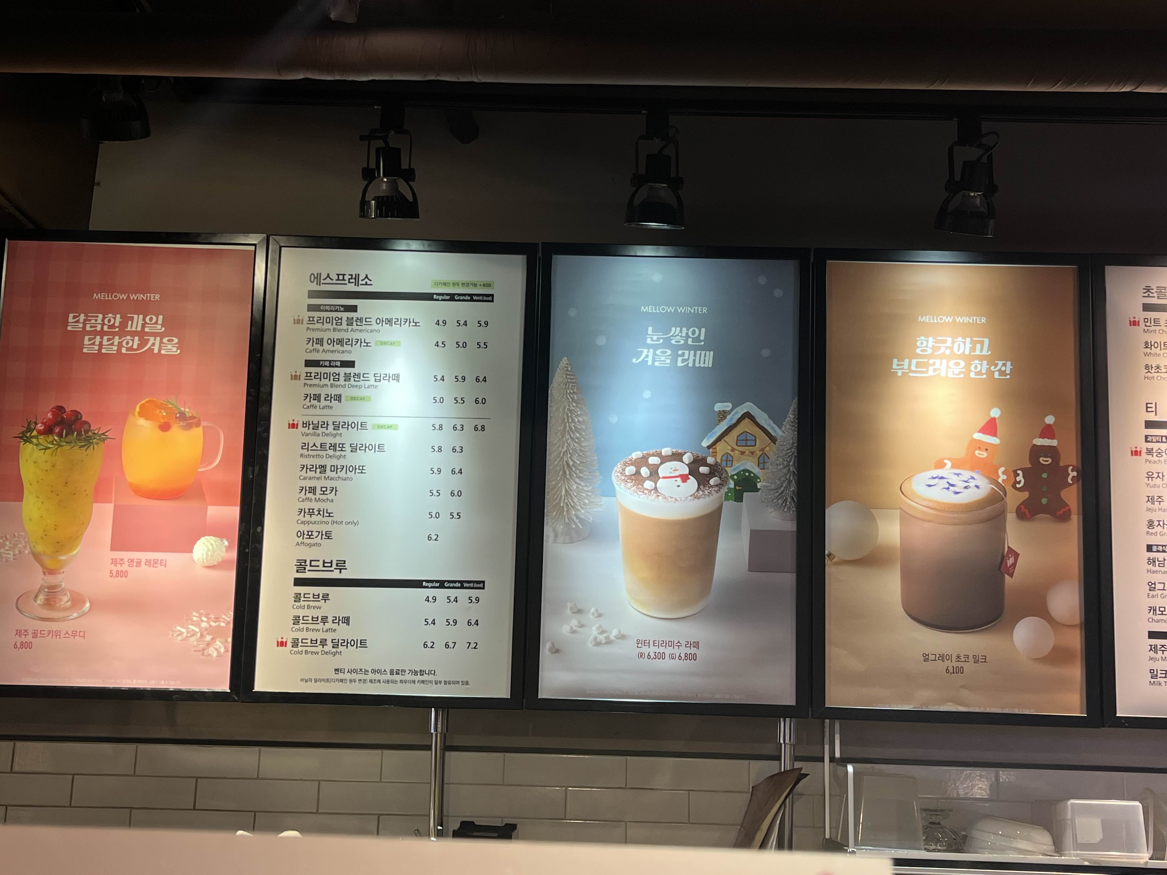할리스 메뉴입니다. 겨울이라 그런지 윈터 티라미수 라떼, 얼그레이 초코 밀크 등 겨울 시즌메뉴도 있습니다.