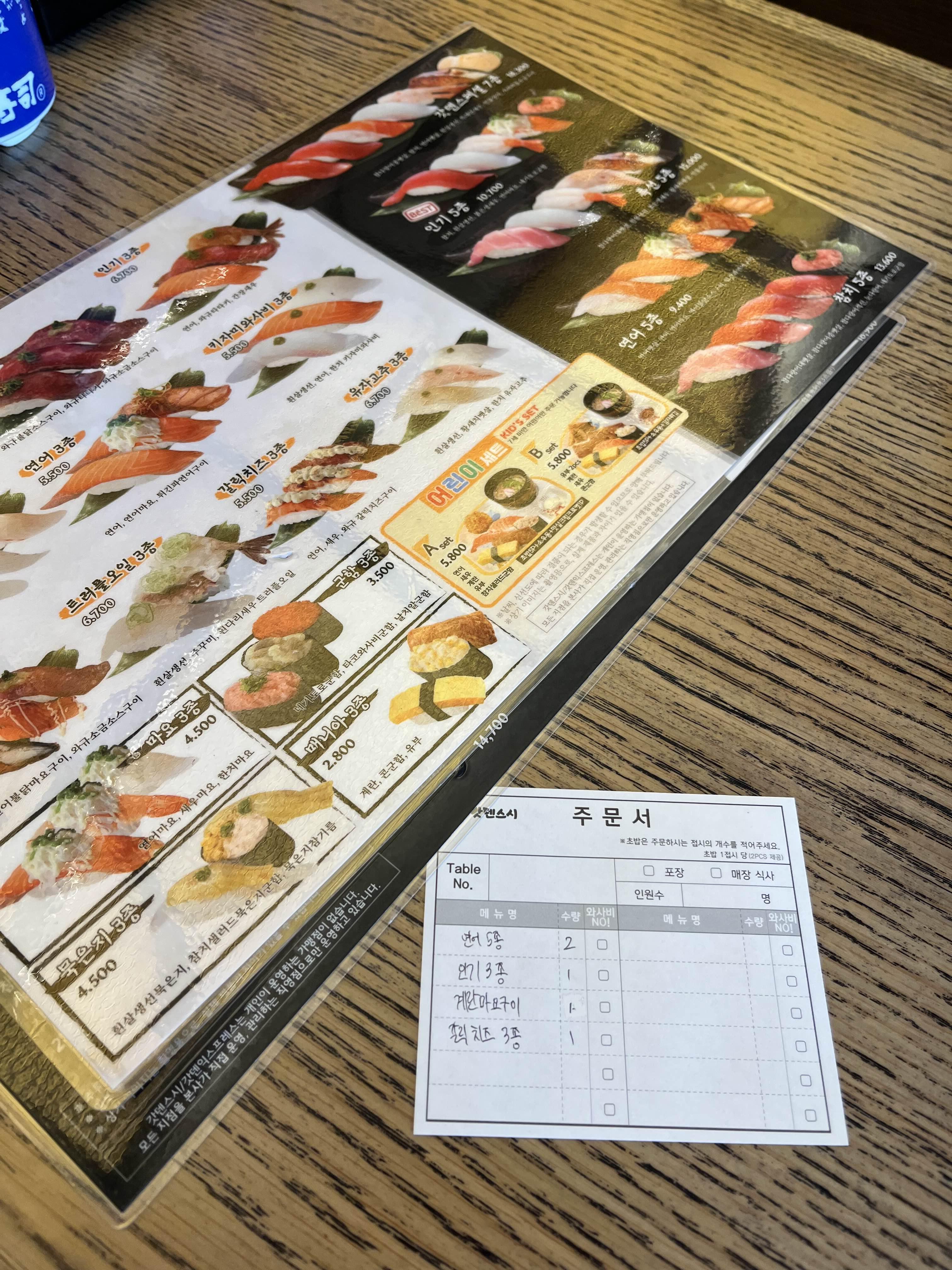 옆에 돌고있는 회전초밥을 먹어도되고, 이렇게 주문서에 적어서 받으면 먹기좋게 가져다주십니다.