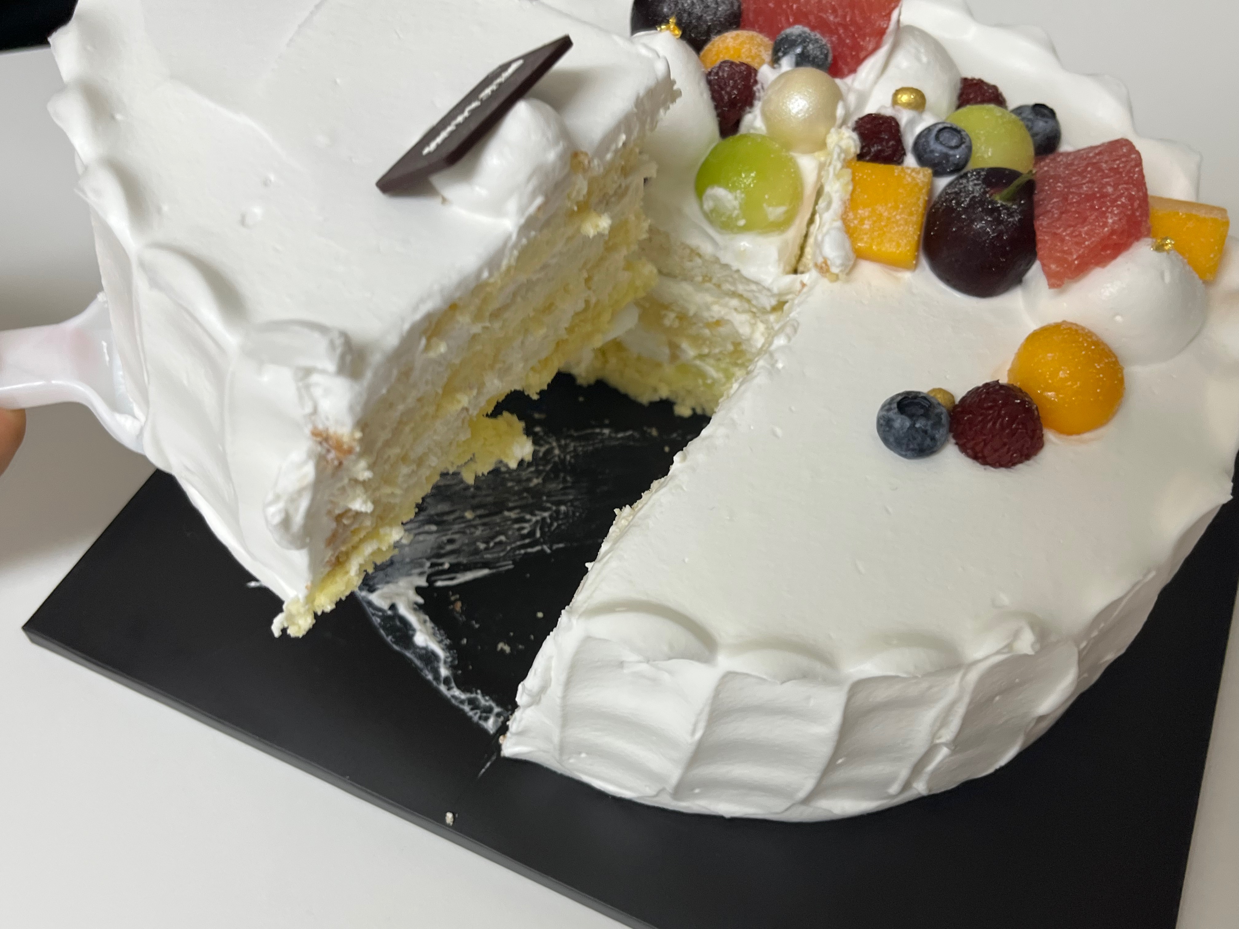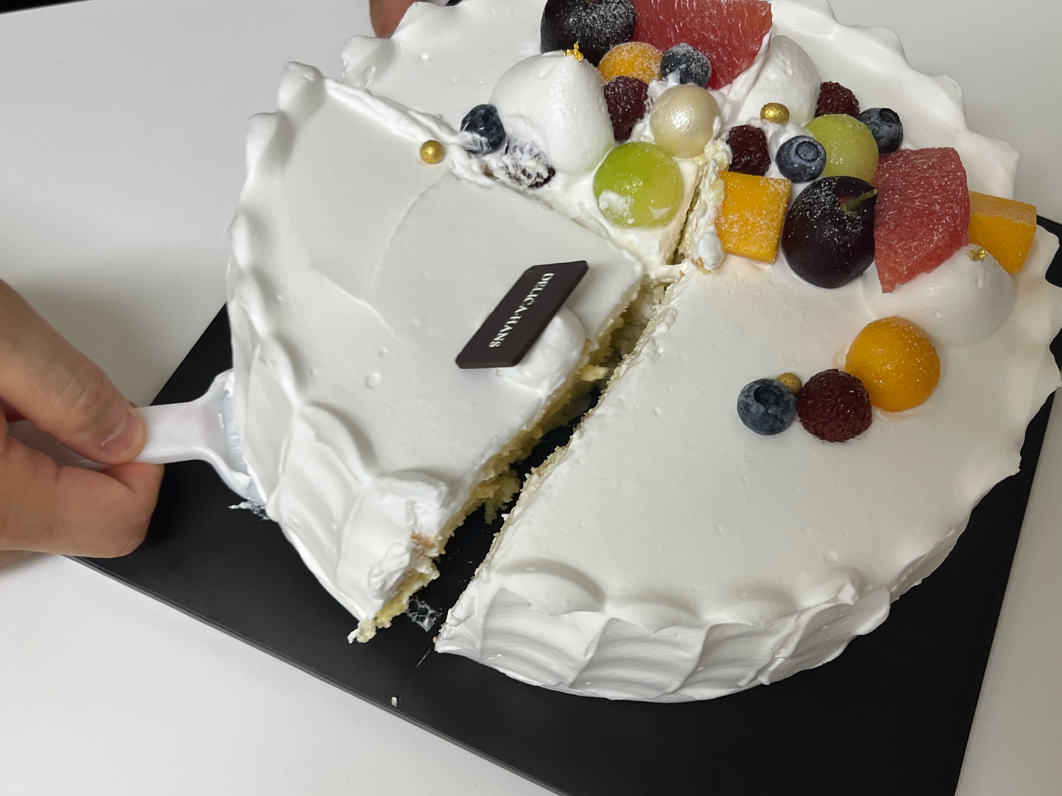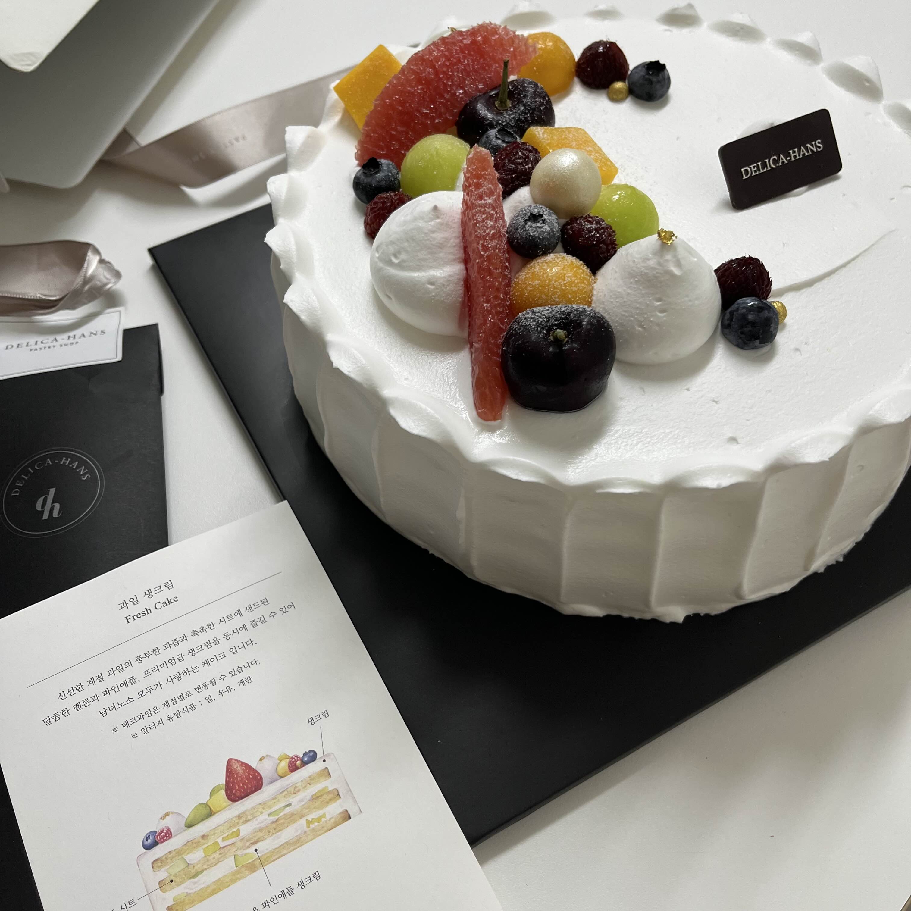 데코 과일은 계절별로 변동이 있다고 합니다. 저는 메론 시트에 자몽과 블루베리 등 데코 있는 생크림이 올려진 것을