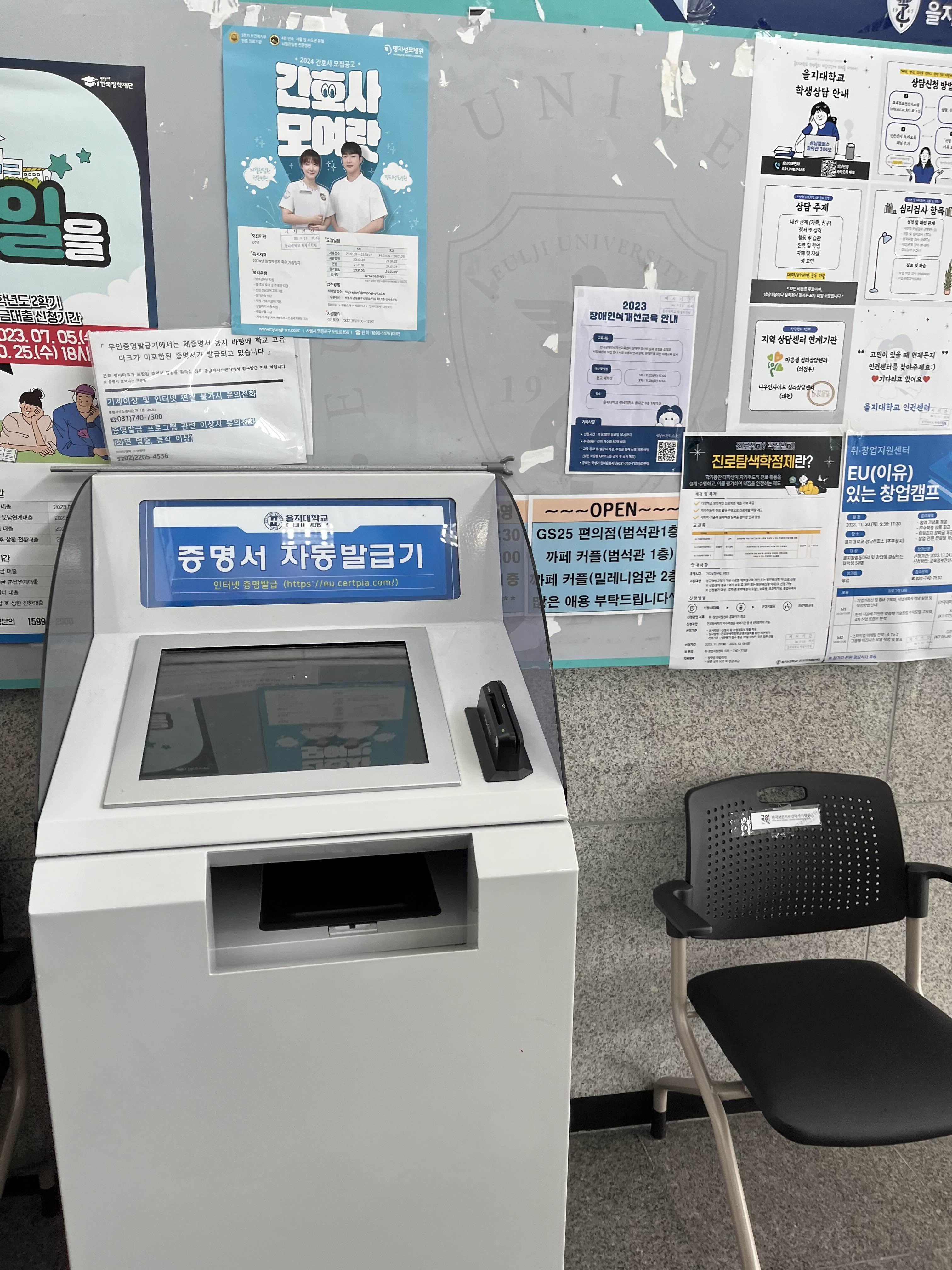신분증을 가지고 오지 않은 분들을 위해서인지 을지대 1층에 증명서 발급가능한 기계도 마련되어있습니다.