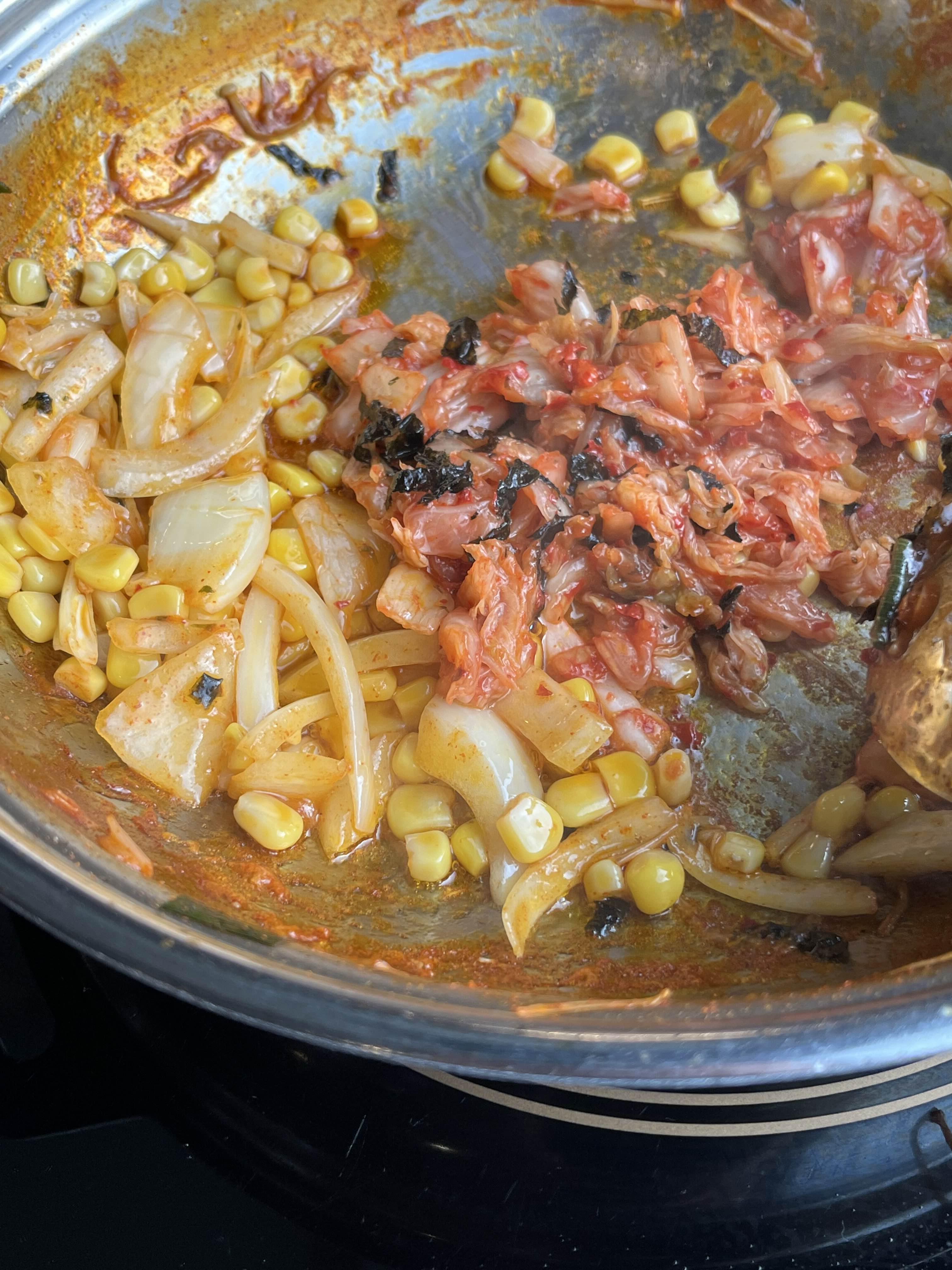 김치, 옥수수, 양파 등을 볶아준 후 밥을 넣고