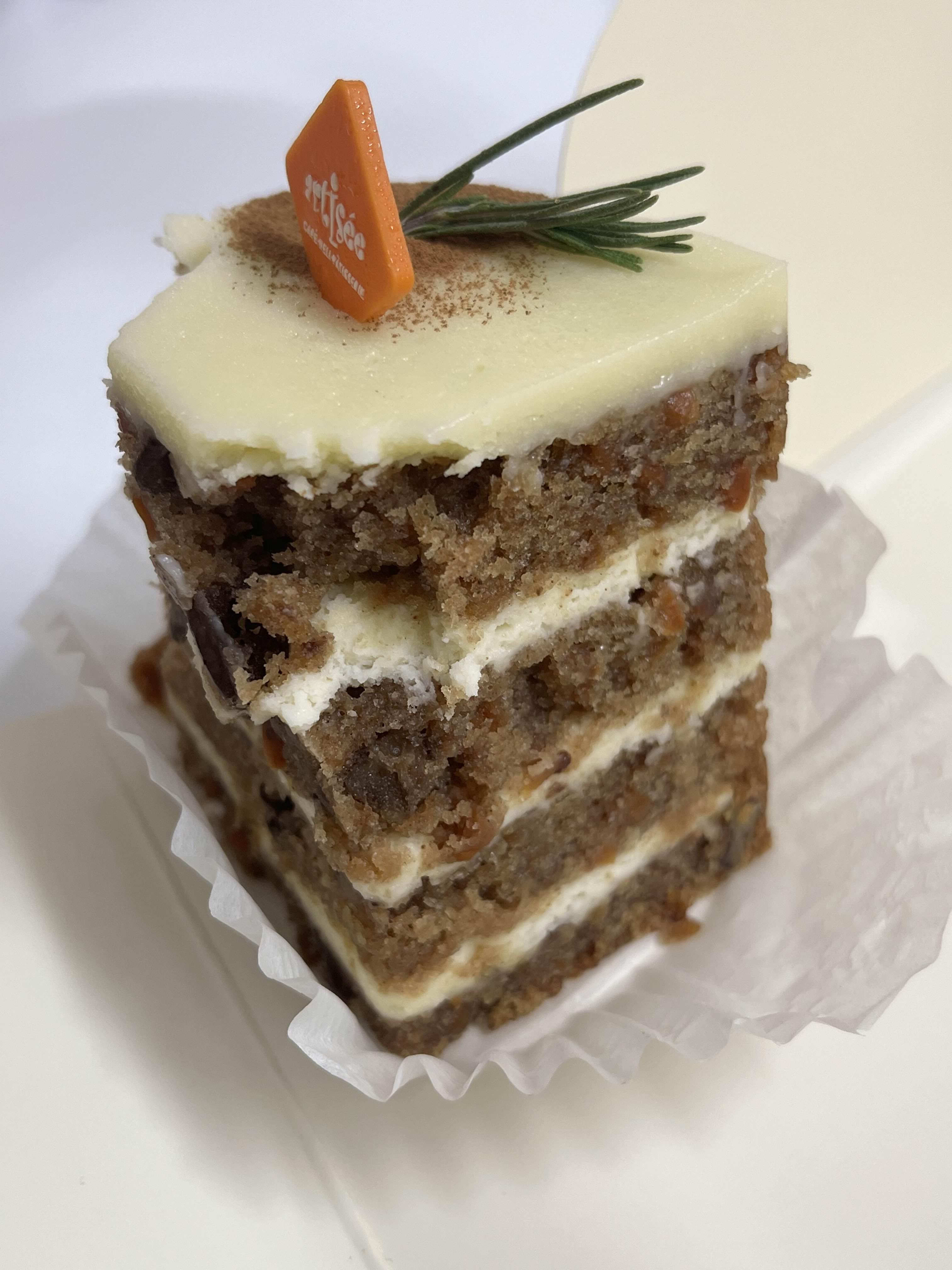 제주 당근과 부드러운 크림치즈와 고소한 피칸을 듬뿍 넣은 당근 케이크입니다.