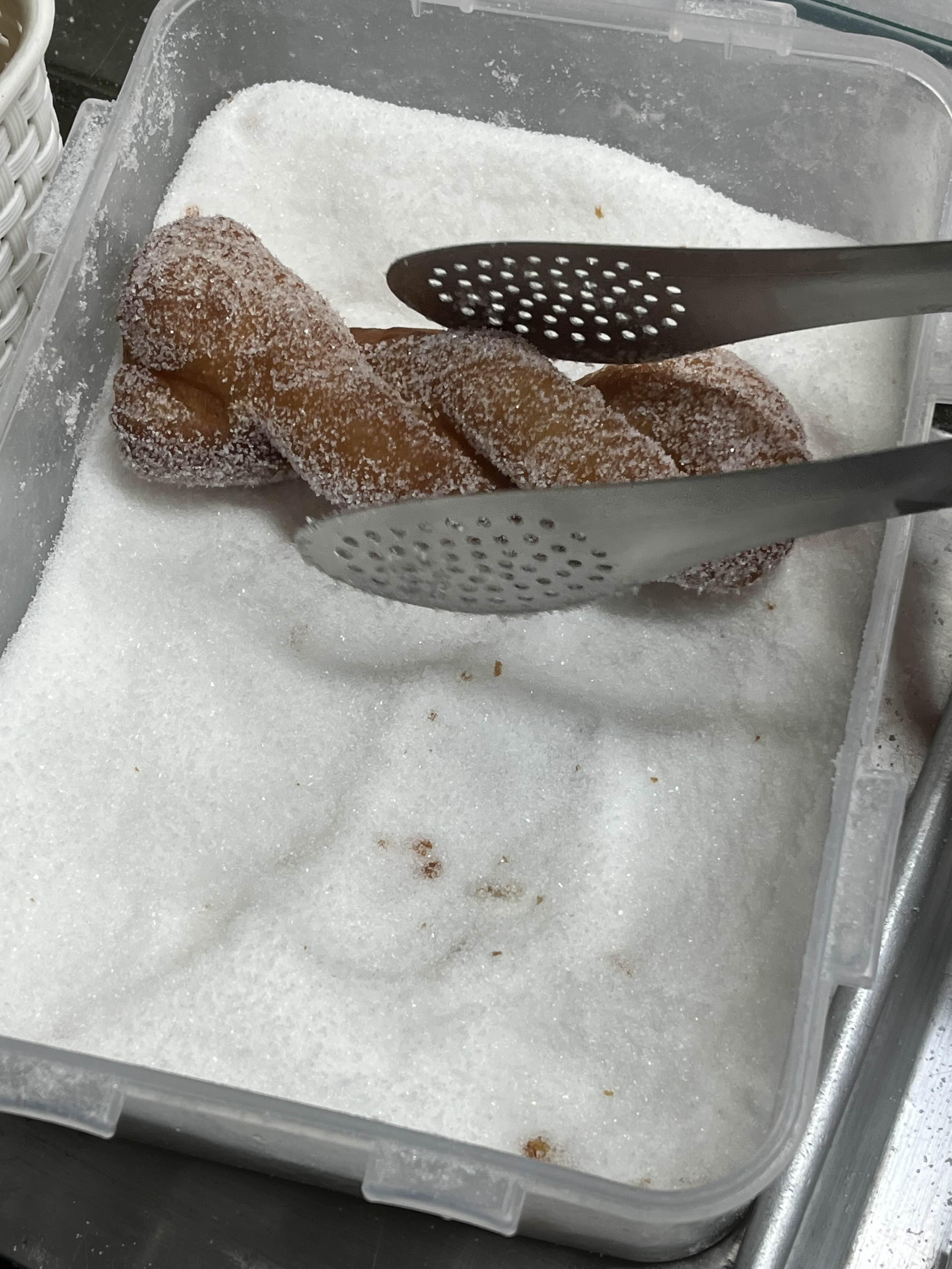 팥도너츠, 꽈배기가 이렇게 진열되어 있는데 본인의 취향에 맞게 설탕을 묻혀서 가져가도 되고,