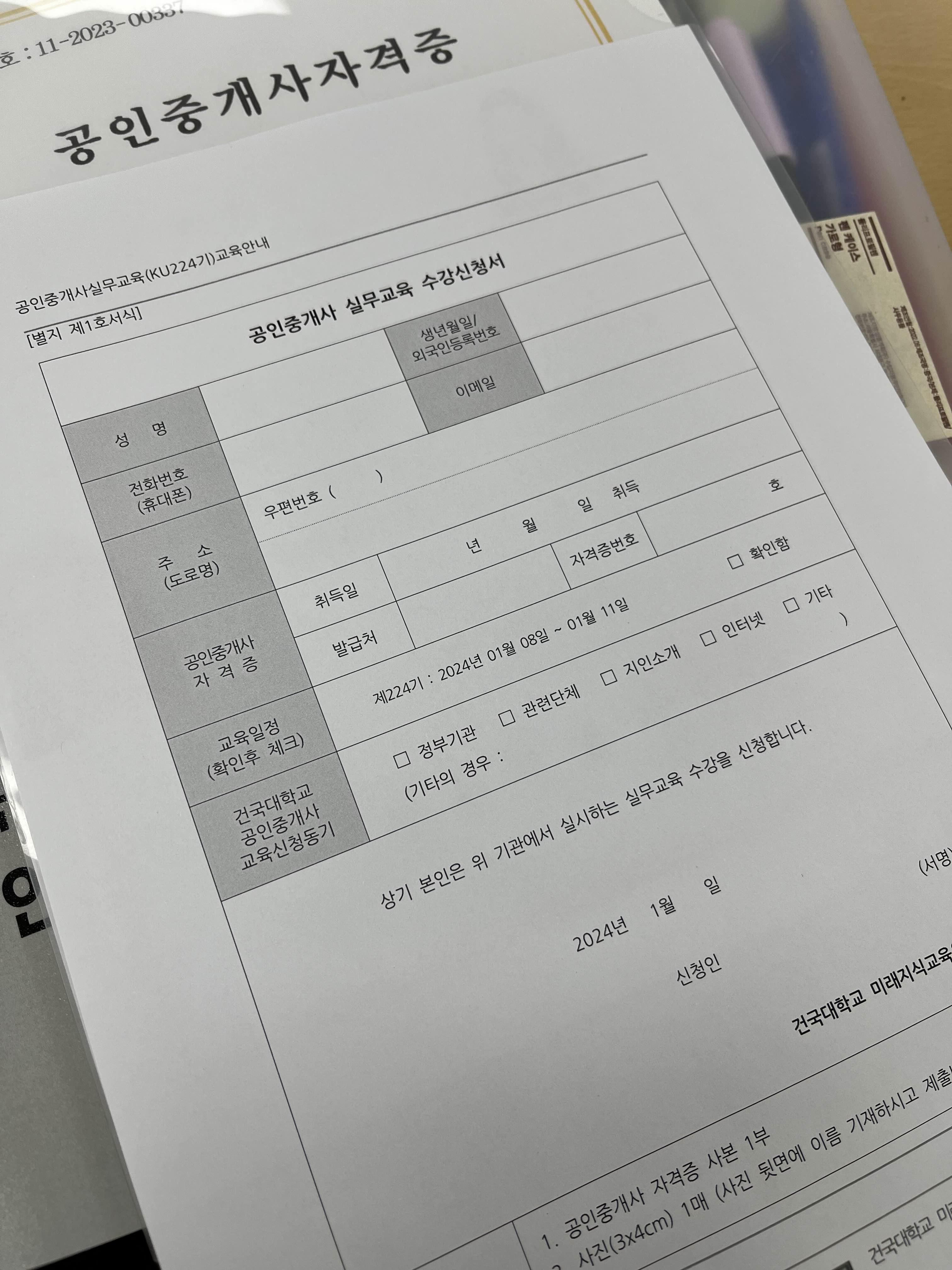 실무교육 수료증을 받기 위해선 공인중개사 자격증 사본 1부, 사진 1매, 수강 신청서를 작성해서 조교님께 제출하면 됩니다!