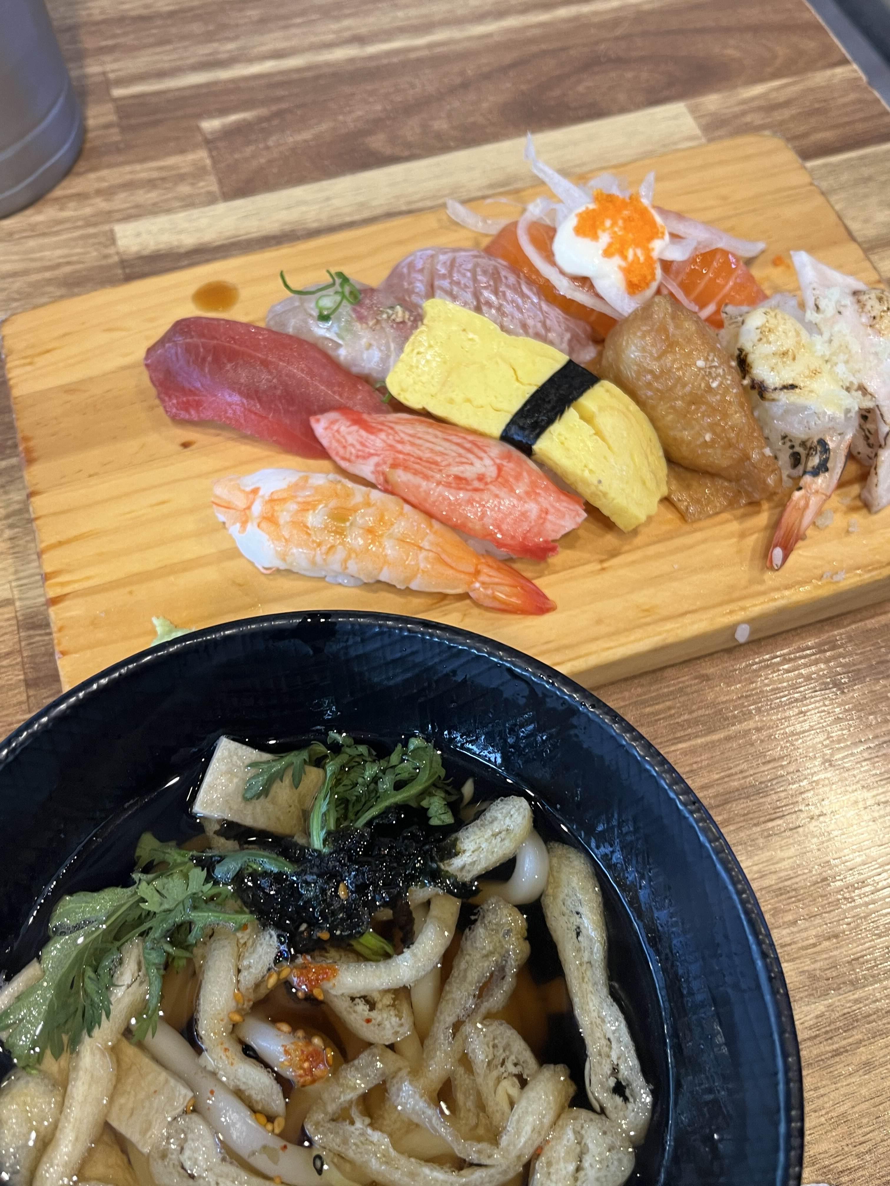 먼저 나온 우동과 스시입니다. 홀에서 먹으면 우동까지 주니 가성비 최고인듯해요!