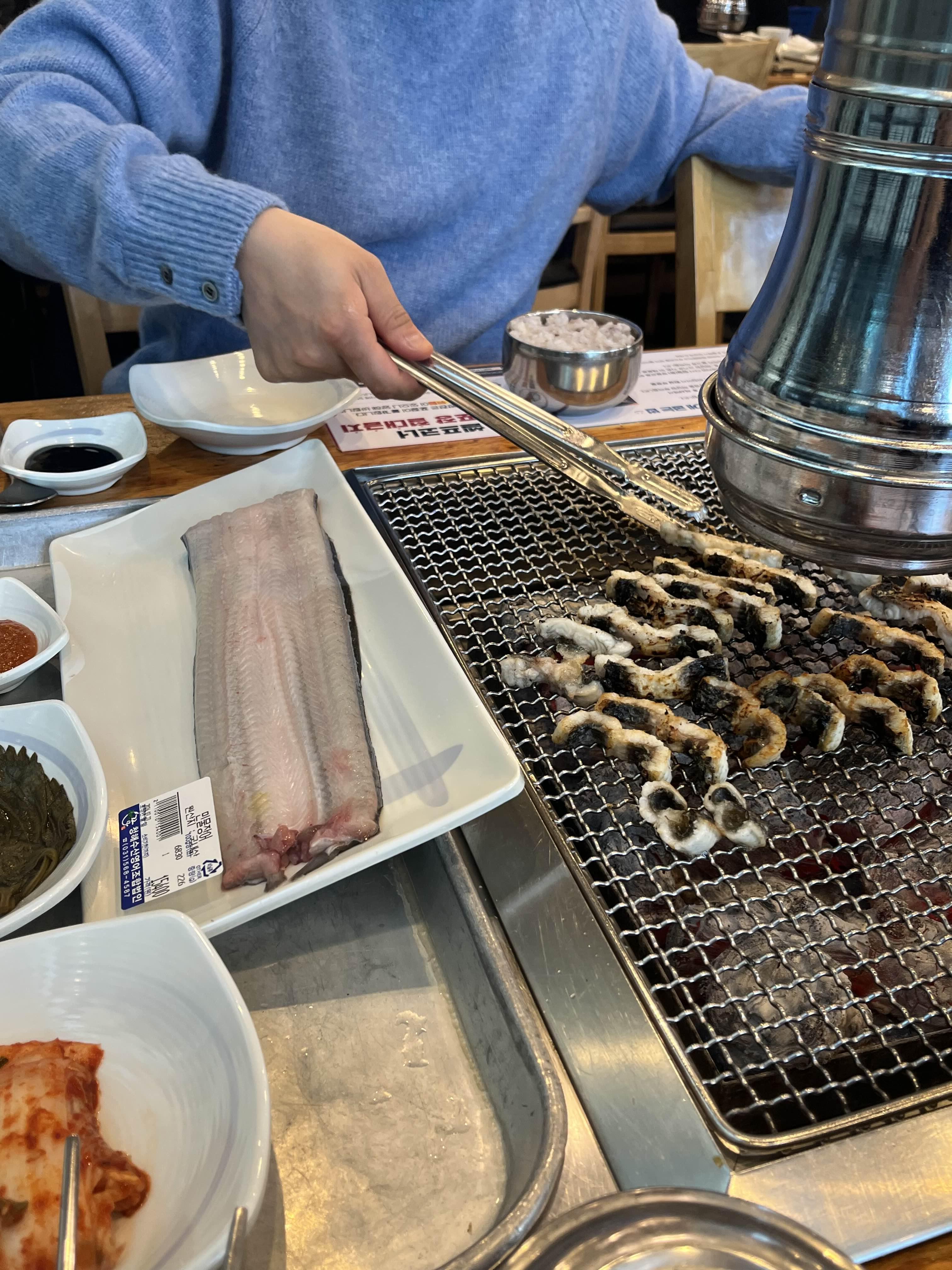 2. 불판에 달라붙지 않도록 30초정도 후 석쇠에서 한번 떼어주고 흰살 부분에 천일염을 적당량 뿌려줍니다.