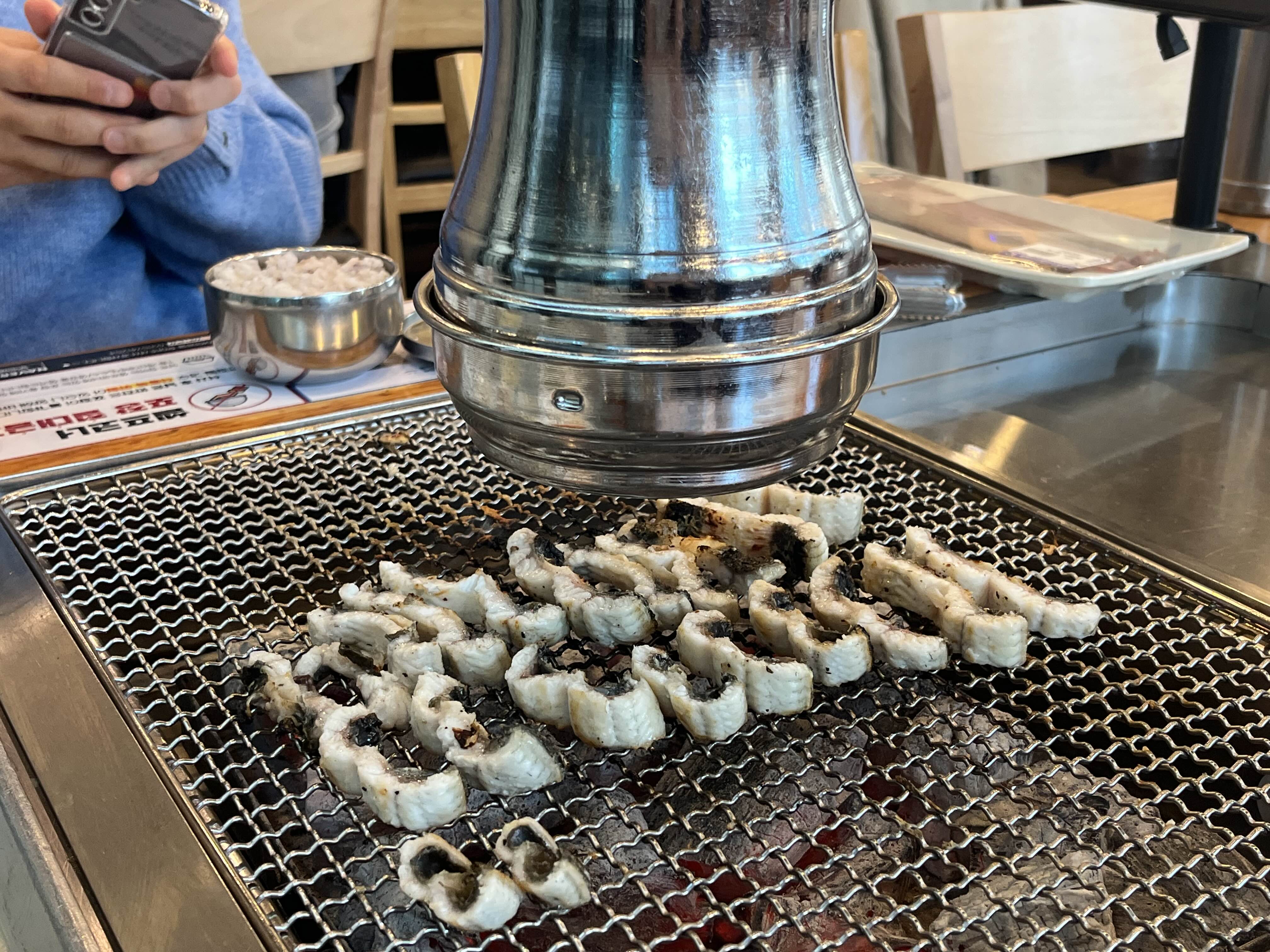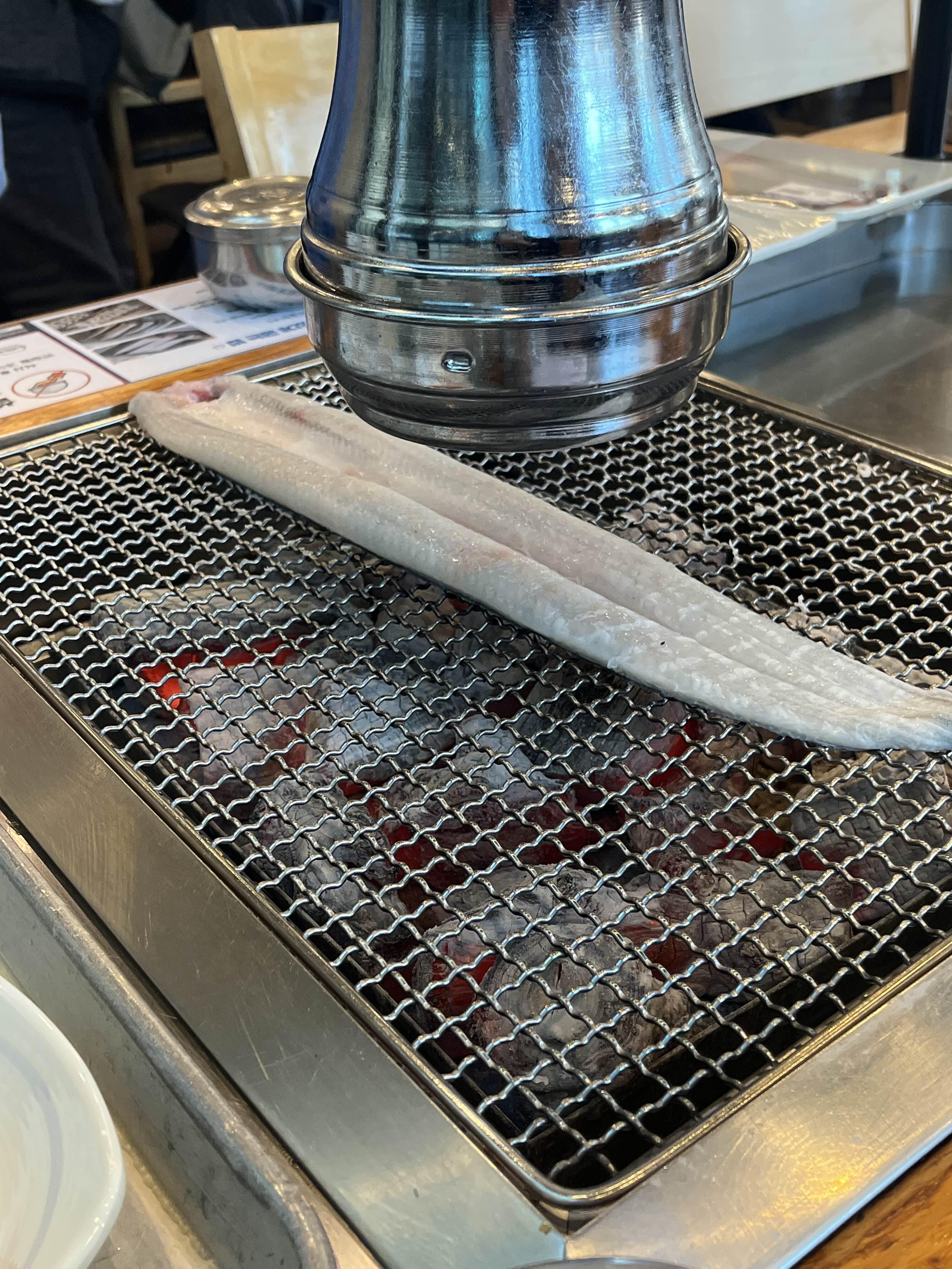1. 장어의 껍질(등)부분을 먼저 불판에 올립니다.