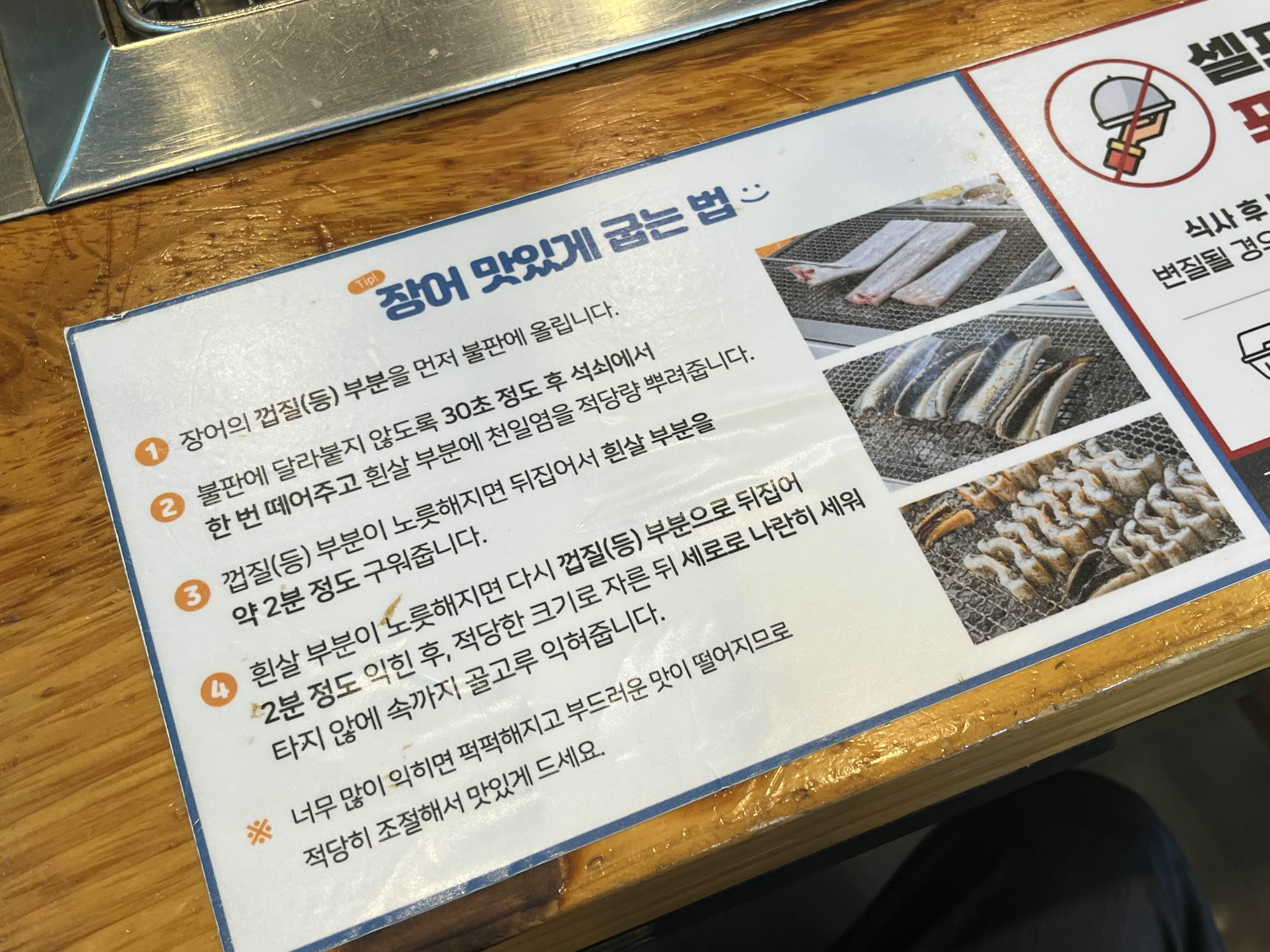 테이블에 장어맛있게 굽는 방법에 대해 적혀있습니다.