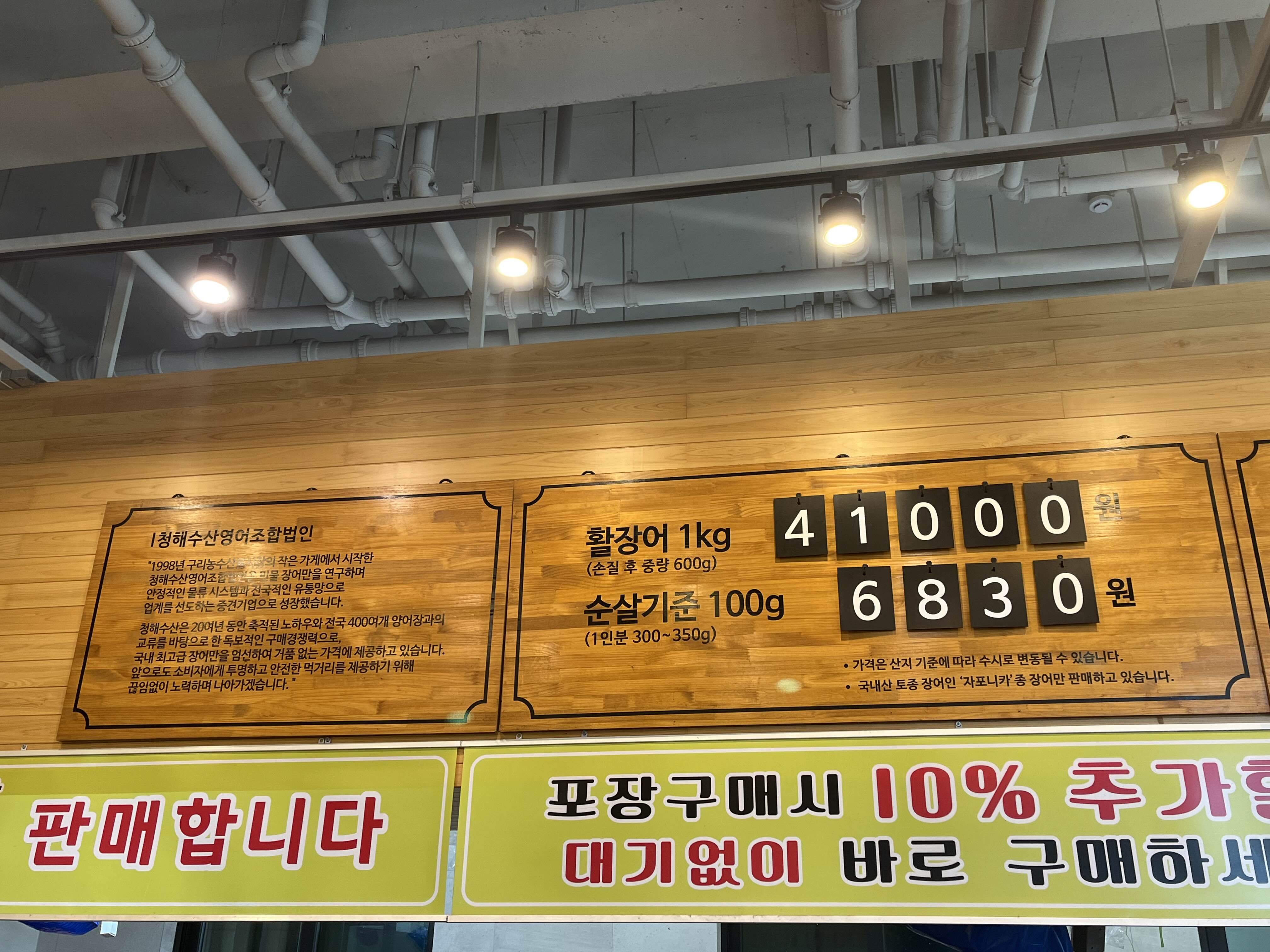 활장어 1kg 41000원이고 저는 남편이랑 둘이 방문해서 3만원대로 골랐어요. 그렇게 먹어야 양이 적당하더라구요!