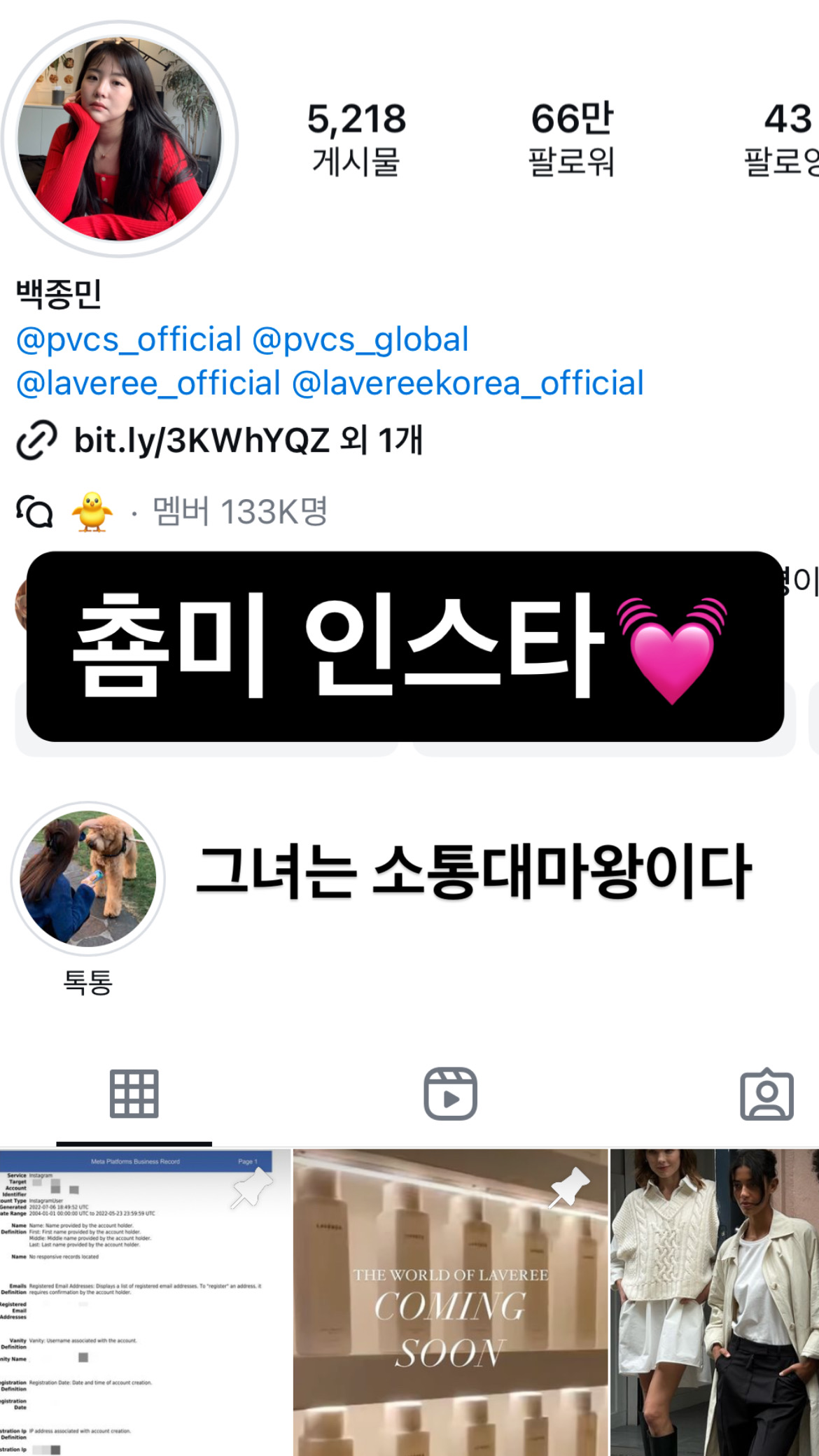 인플루언서 이면서 PVCS의 CEO이기도 합니다. 춈미가 유명해진 계기는 인스타에서 '라이언 인형'을 숨겨놓았다가 서프라이즈 선물을 하는 영상과 솔직하고 잘먹어서 사람들의 이목을 끌었습니다. 저 역시도 규민이 태어났을때부터였을까 고인물이 되버린듯한 팔로워이기도 합니다. 사람들이 유재석이 친근한 이유가, 우리랑 함께한 세월때문에 이제는 유재석은 가족이라 편안함이 느껴져서 유느님을 좋아하는 거라고 어디서 들은적이 있습니다. 저에게 춈미란... 연예인이면서, 저의 롤모델 제가 가장 좋아하는 인플루언서입니다.