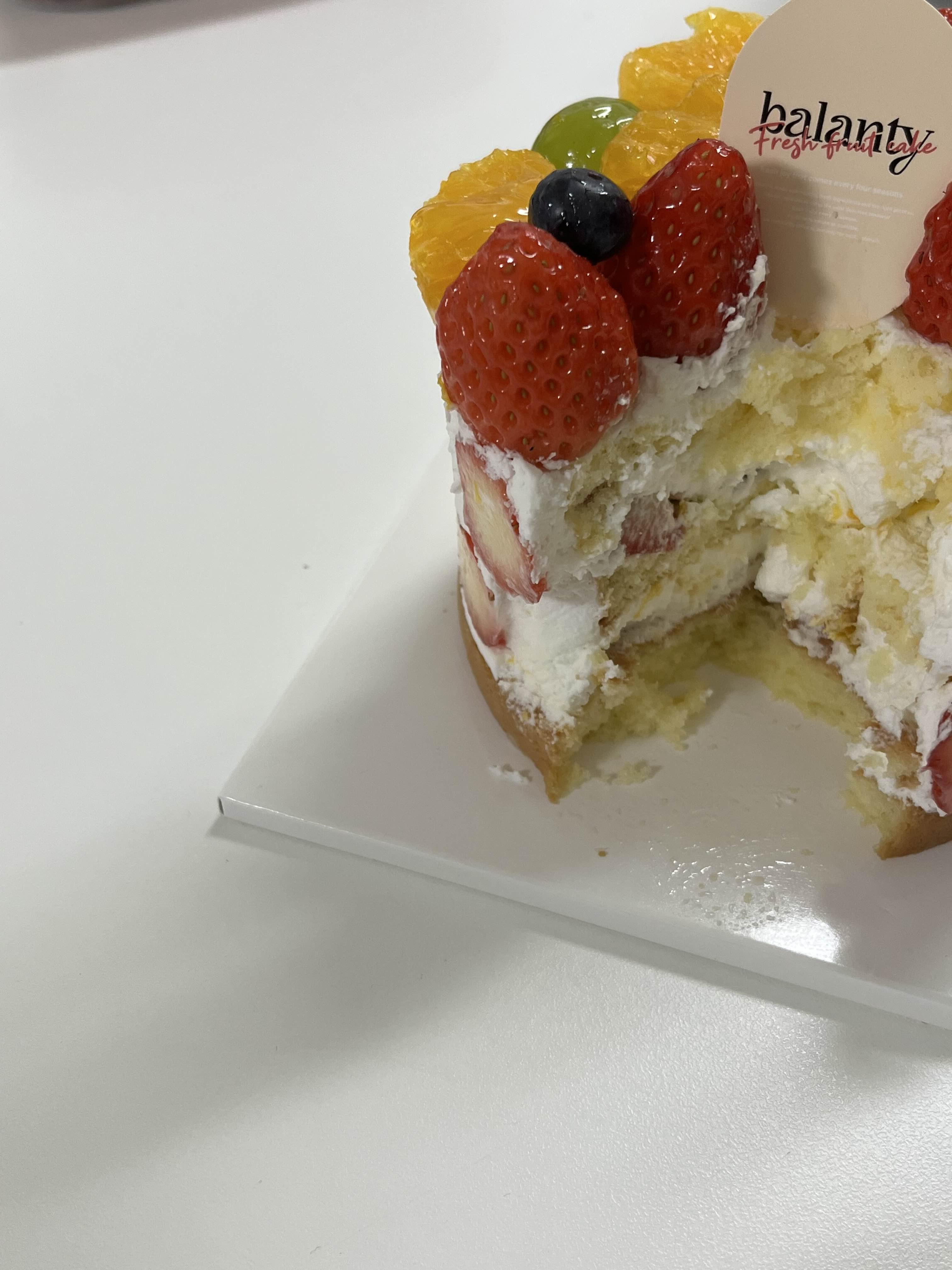먹으면서 단점이 있었어요. 맛은 있는데 케이크를 조각으로 자를 수 없어요. 층층에 겹겹이 과일들이 있어서 그런가