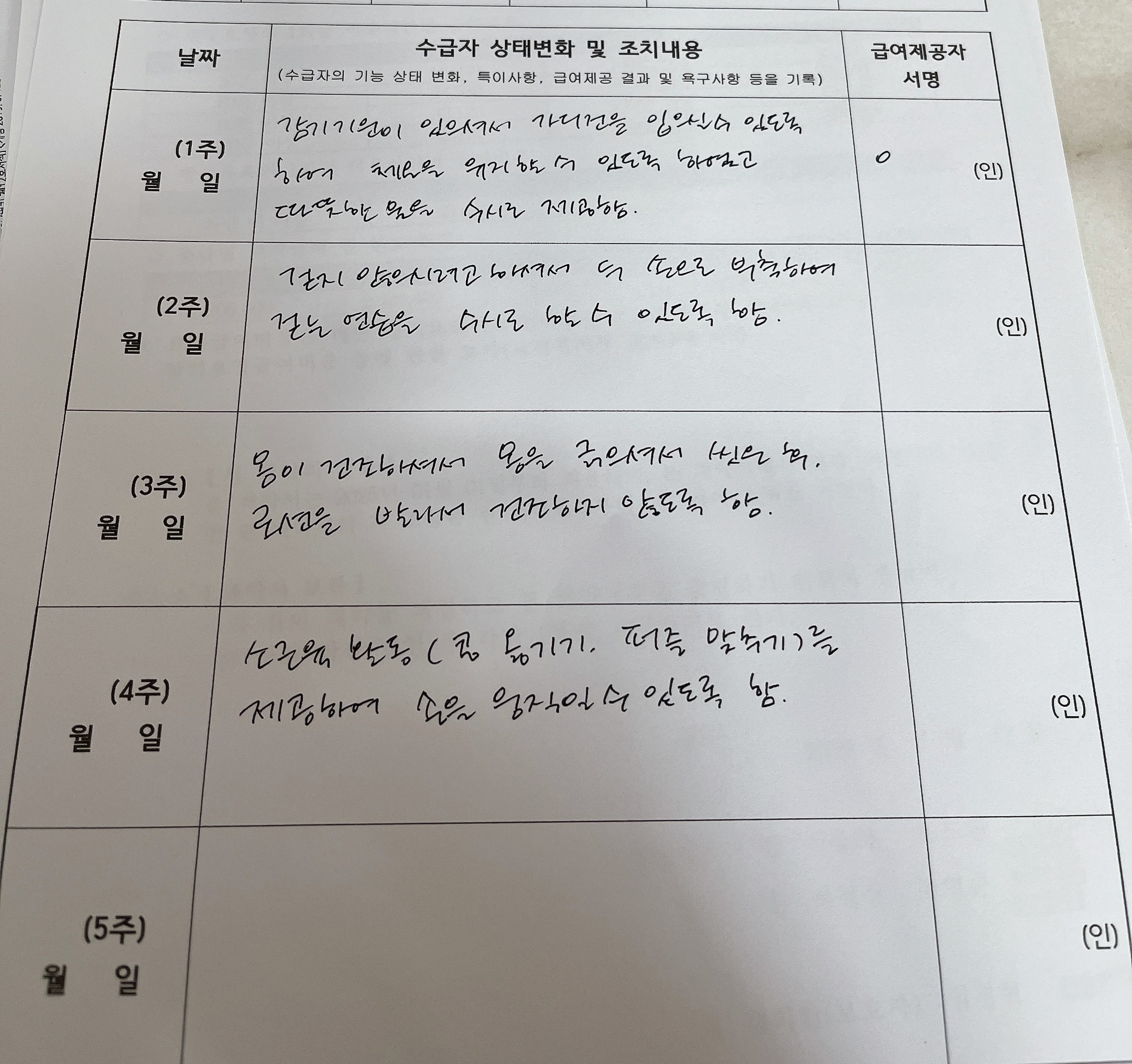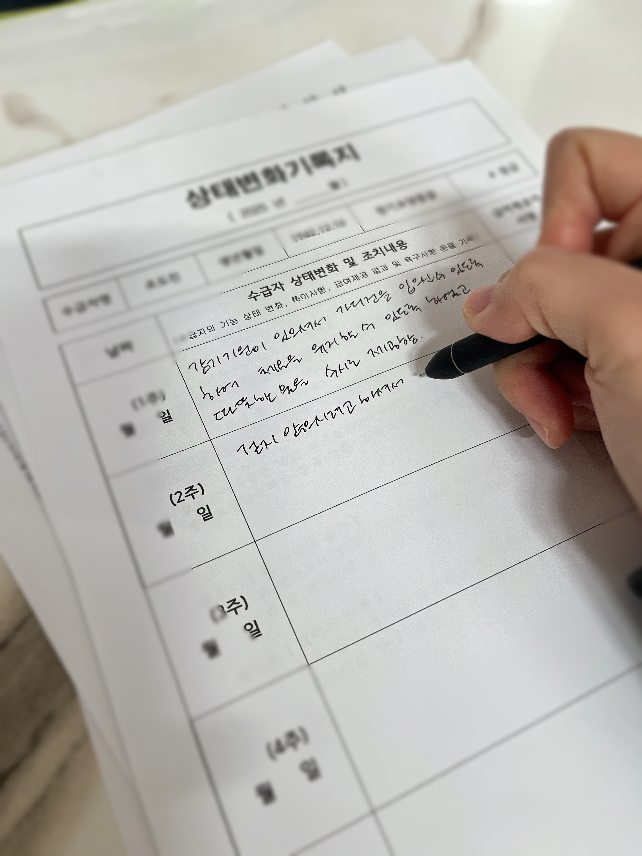 요양보호사 상태변화기록지 작성방법은 대상자의 건강과 안전을 보장하는 데 핵심적이다. 정확하고 객관적인 기록을 통해 더 나은 돌봄 서비스를 제공할 수 있다. 요양보호사로서 전문성을 발휘하기 위해 기록 습관을 철저히 지키는 것이 중요하다 다. 요양보호사 상태변화기록지 작성방법은 나같은 경우는 이렇게 작성했다.