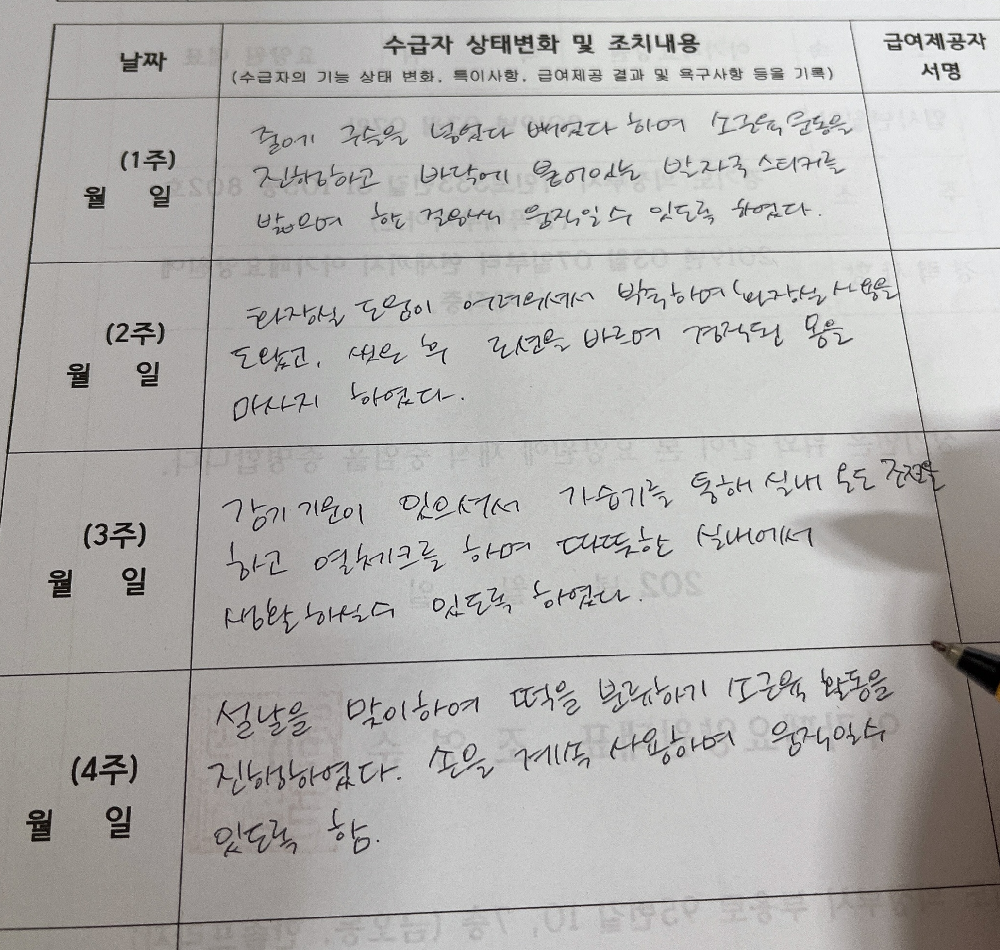 상태변화기록지는 요양보호사로 일하면서 가장 중요한 기록지인데, 나는 주마다 하나씩 쓰는 편이다.