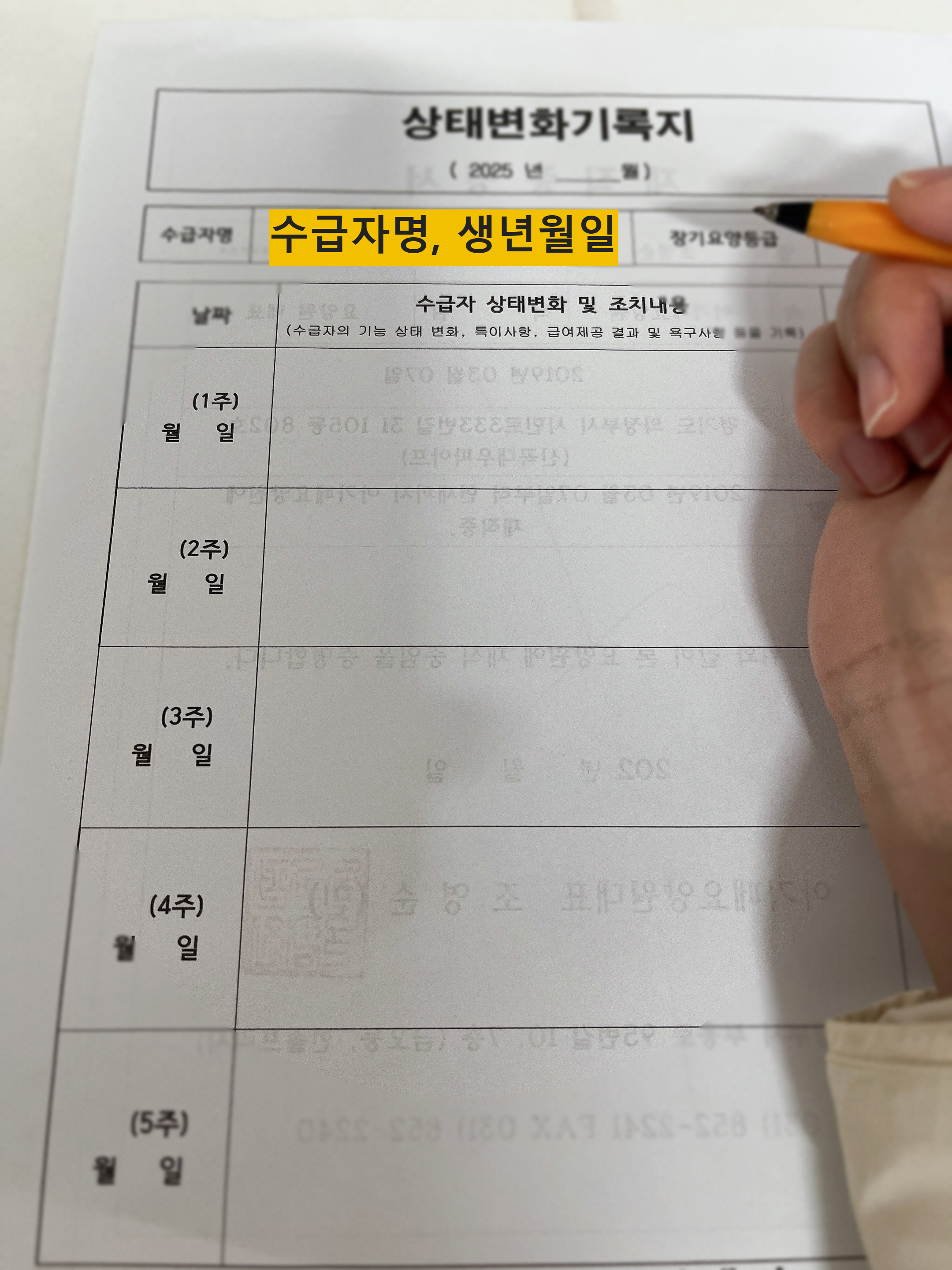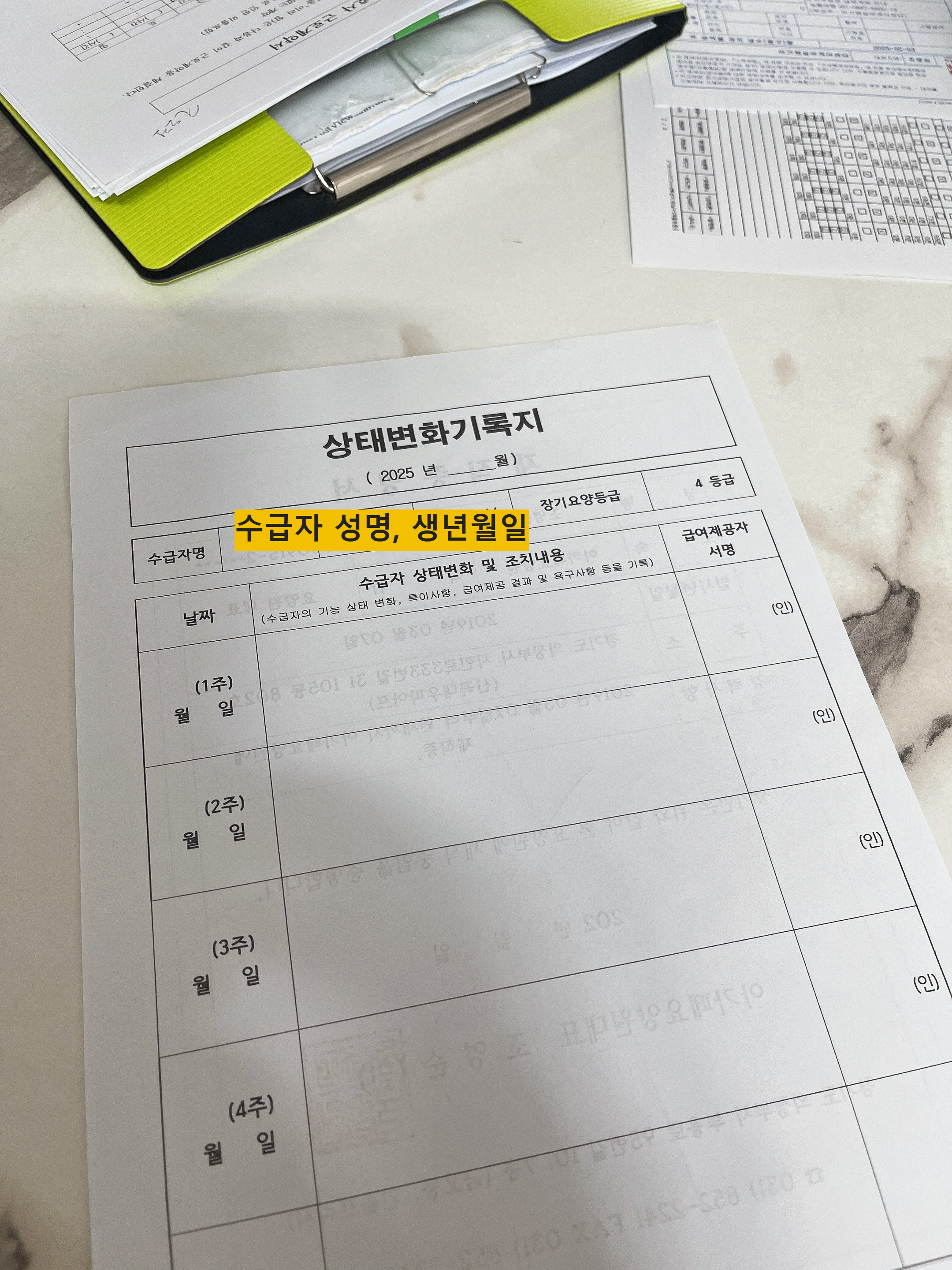 상태변화 기록지는 수급자의 상태변화 및 조치내용을 적는것이다.