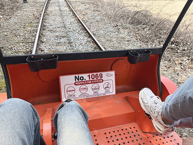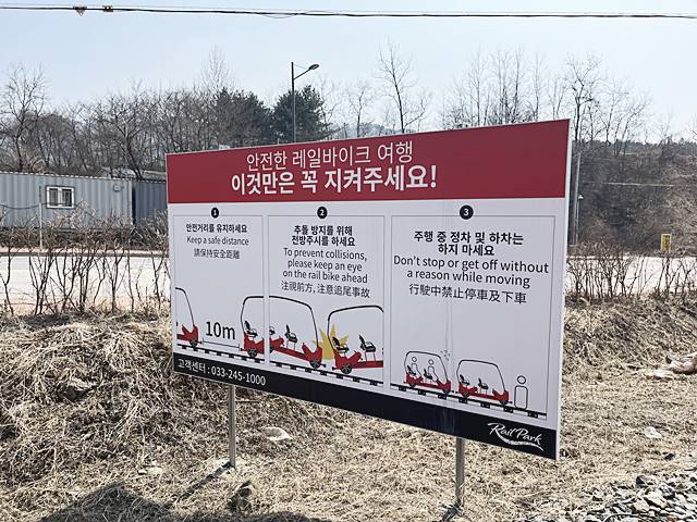 레일바이크 여행 안전거리를 꼭 유지해야한다. 앞에 있는 레일 바이크랑 부딪히게 되서 사고가 난다면 뒤에 있는 사람 사고로 처리를 해야된다고 한다. 그러니 꼭 안전거리 유지하면서 타시고, 추돌방지를 위해 전방을 주시해야하고 주행중 정차 및 하차는 금지다.