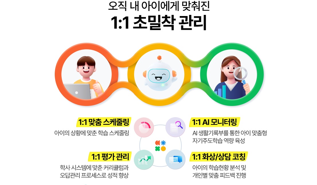 관리교사는 월2회(전화1회, 화상1회)로 아이들을 관리하고 동기부여 및 학습전략을 진행하며 AI드림쌤은 매주 아이들과 상담을 통해 객관적인 학습을 제공한다.