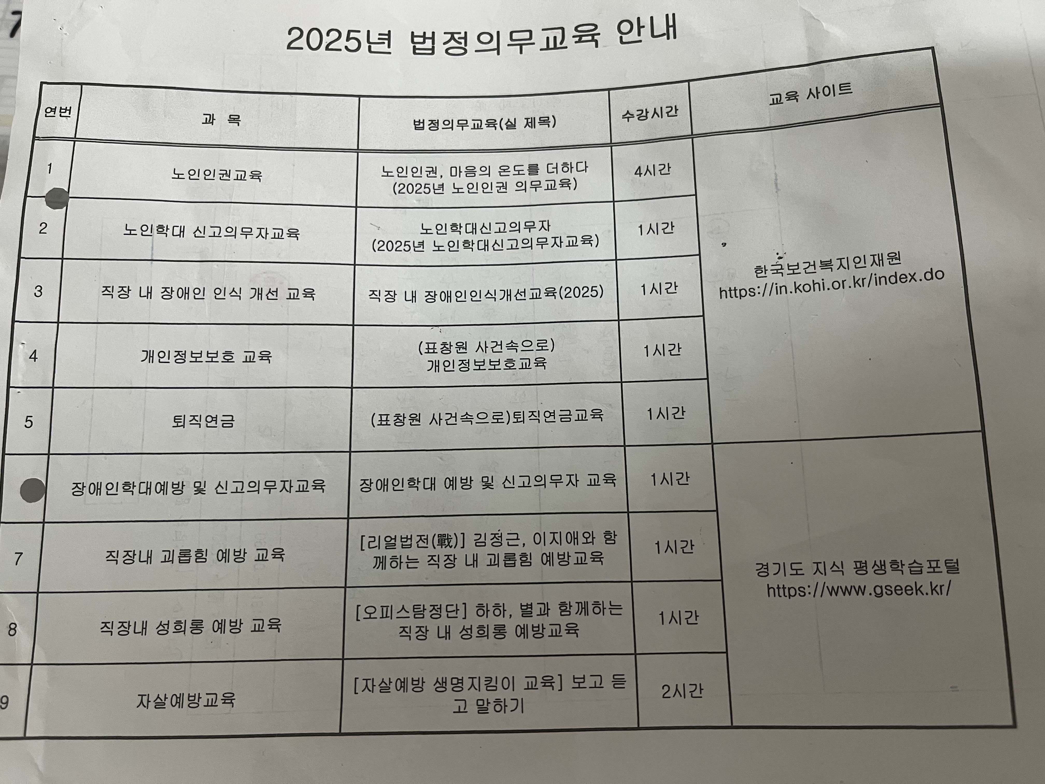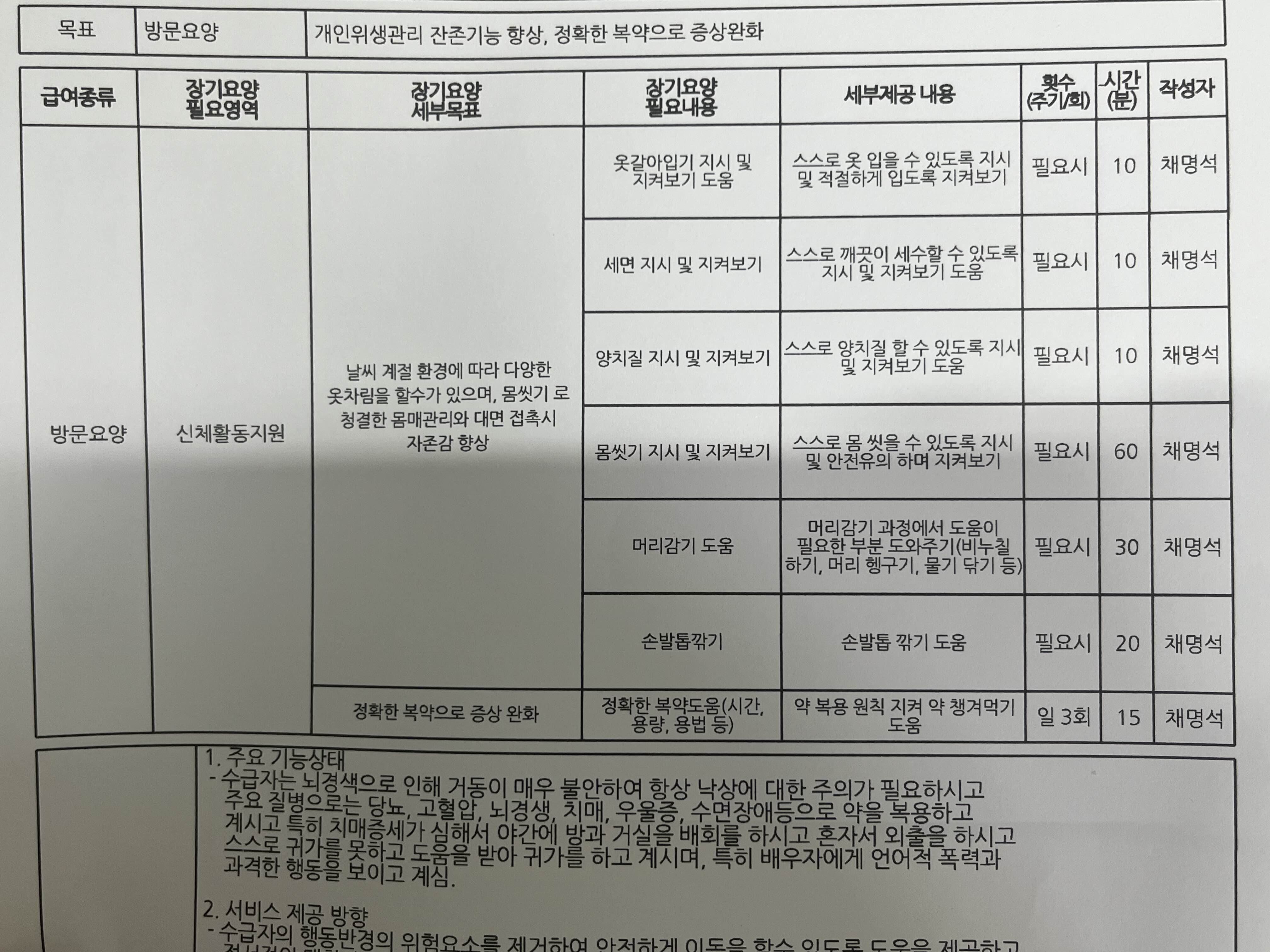 아버님께 드릴 수 있는 신체활동지원이 개인위생 이라던지, 식사도움, 이동도움 드리고 있는데 그렇게 체크하고 90분 하고 태그 종료하면 된다. 그리고 법정의무교육도 건강검진도 받아서 제출을 해야한다.