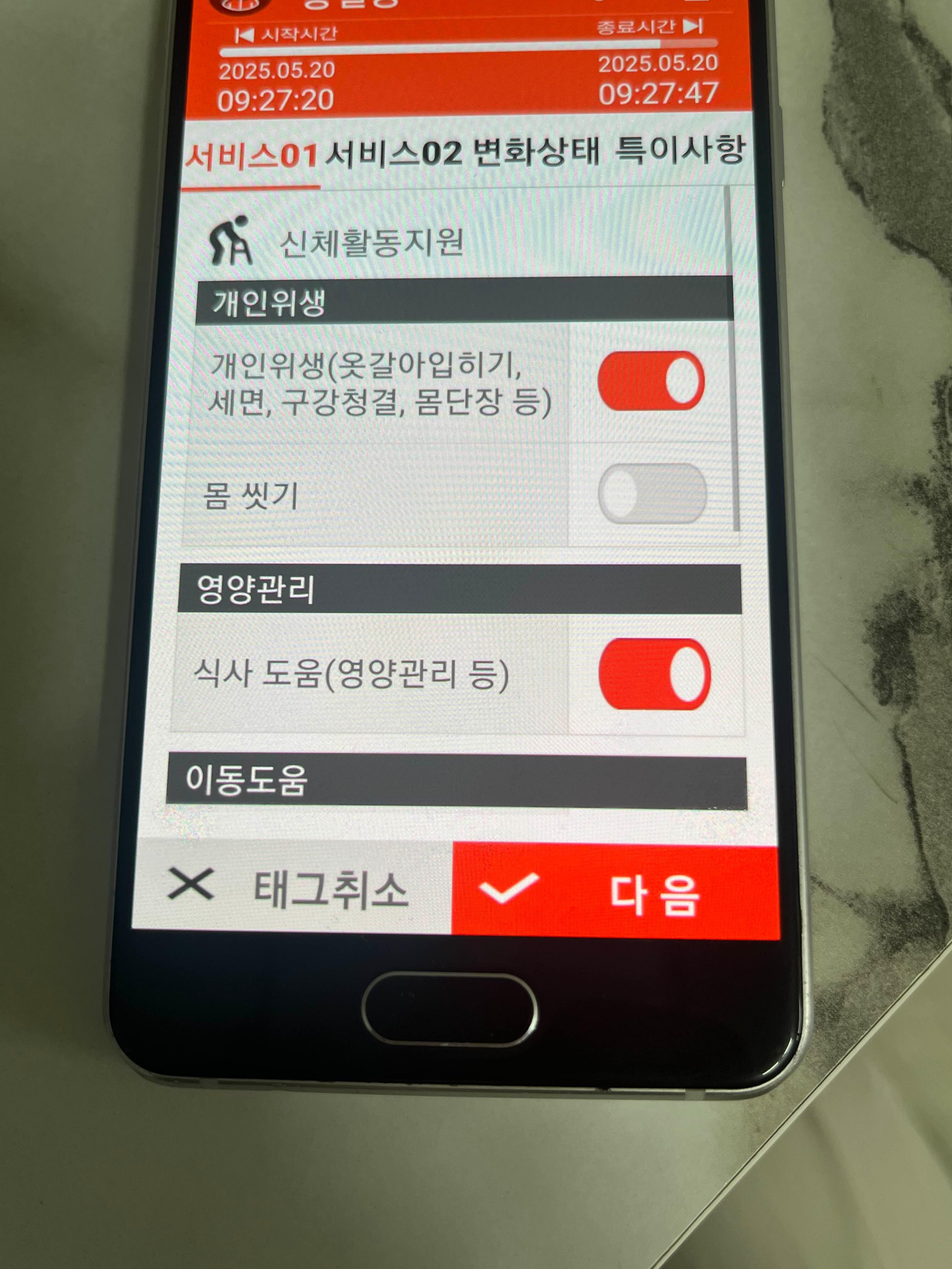 요양보호사 자격증을 취득해서 가족요양으로 4등급 시아버님을 한달에 20일, 하루 1시간을 돌보면서 시작태그, 종료태그를 찍고 있습니다.태그를 찍으면 마지막에 상태변화 작성을 해야하는데,