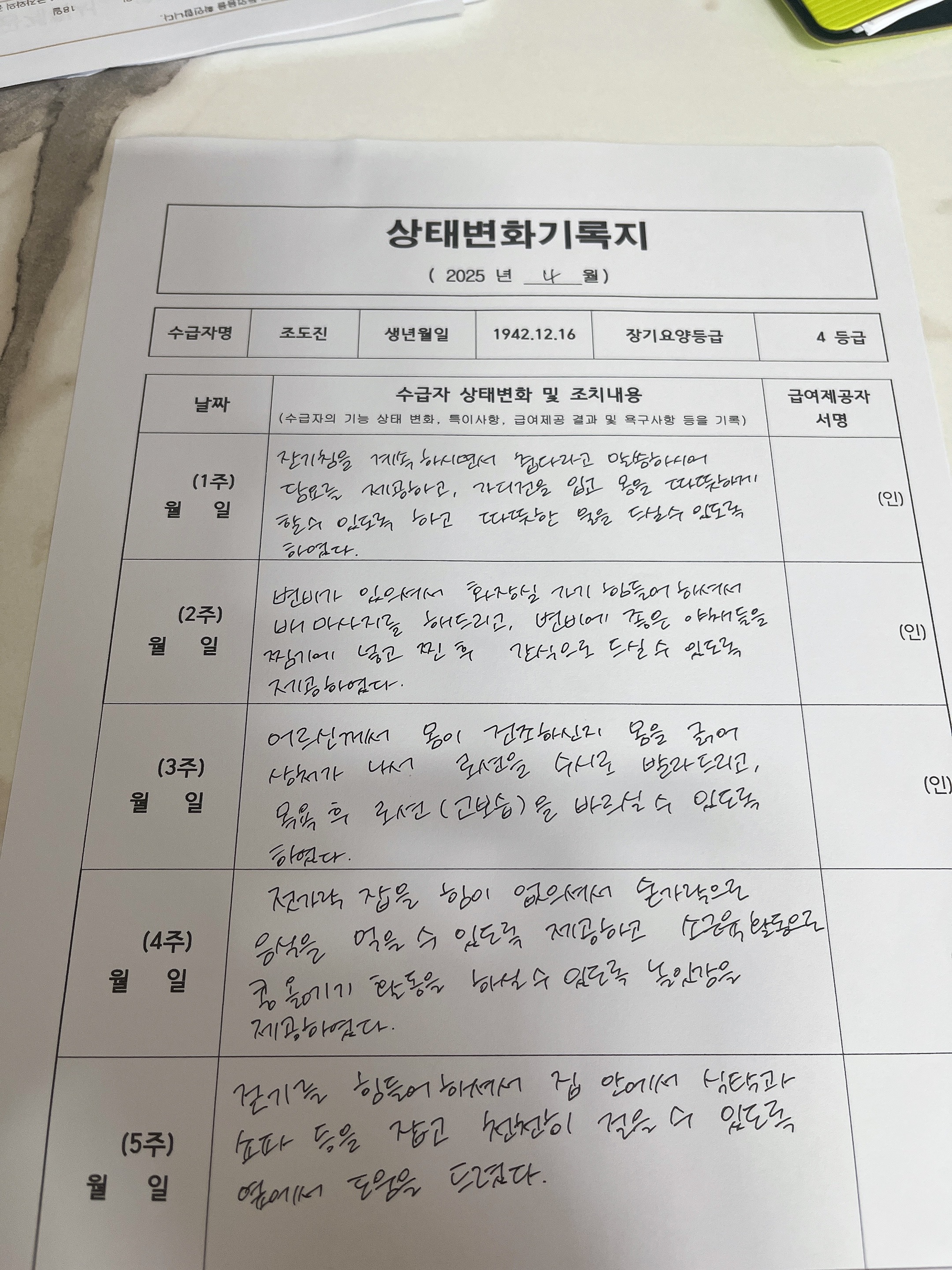 상태변화 기록지는 수급자의 기능 상태변화, 특이사항, 급여제공 결과 및 욕구사항 등을 기록하는건데